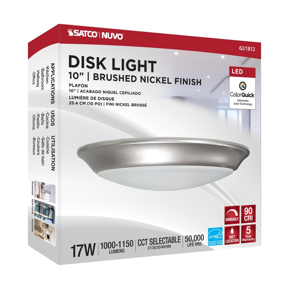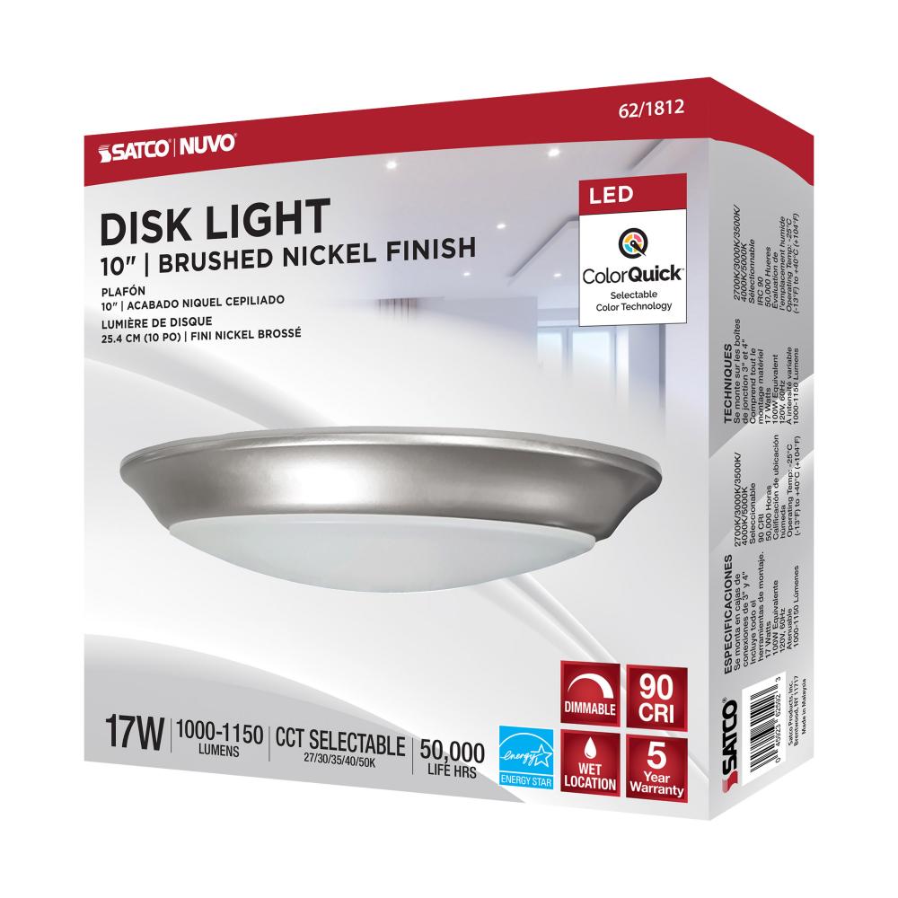 Introducing SATCO NUVO's 62-1812 LED CCT Selectable Disk Light with ColorQuick technology! This 10-inch, 17-watt disk light in brushed nickel features a high CRI of 93, 2.5kV surge protection, and wet location rating. This CCT Selectable Disk Light is