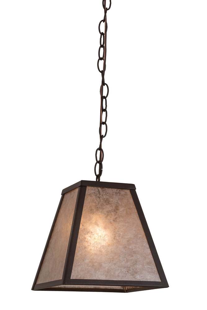 Reminiscent of the Mission revival movement experiencing a resurgence today; this handsome minimalist design features welcoming light evoked through stunning Silver Mica. The decorative shade is enhanced by hardware and straight line accents in a warm Cafe Noir finish. This fixture is handcrafted by Meyda artisans in the USA at the foothills of New York's Adirondack Mountains. Custom colors; sizes and styles are available. Energy efficient options are offered. The fixture is UL and cUL listed for damp and dry locations.