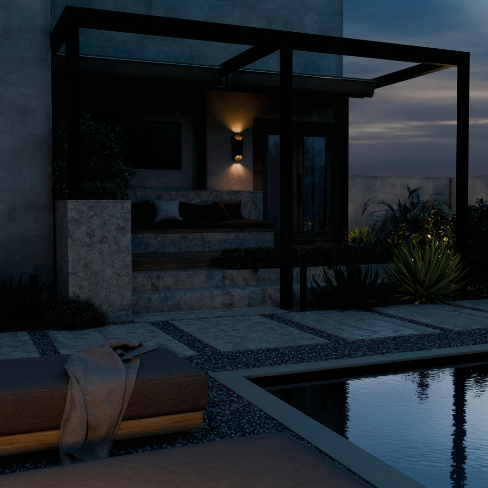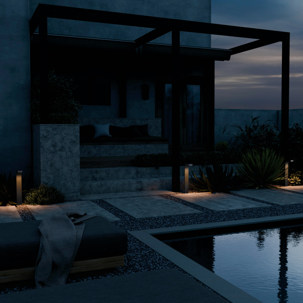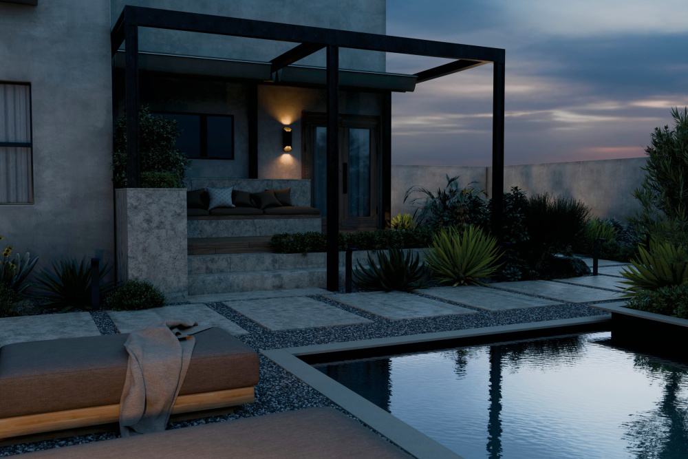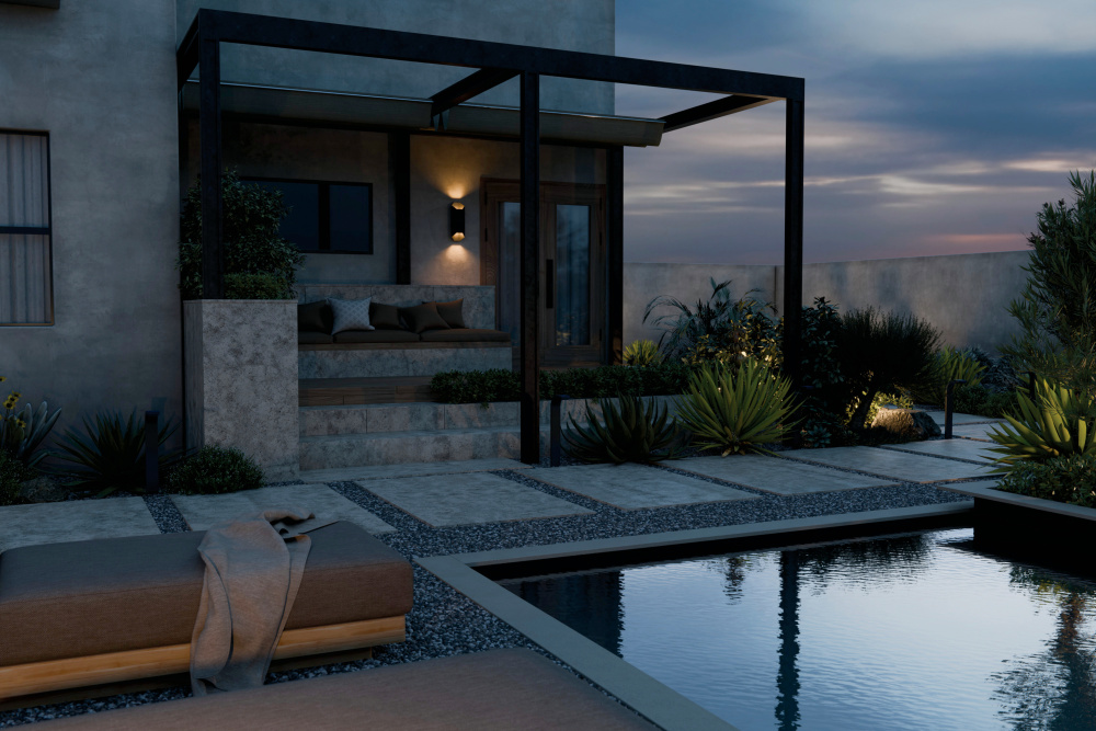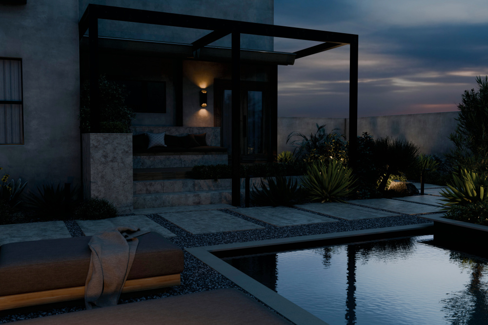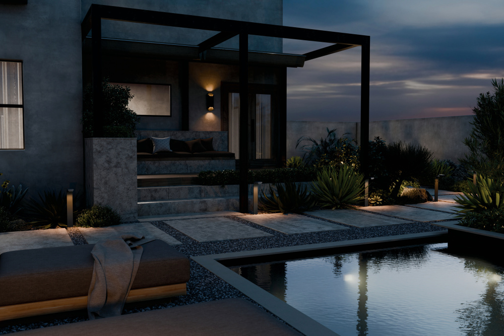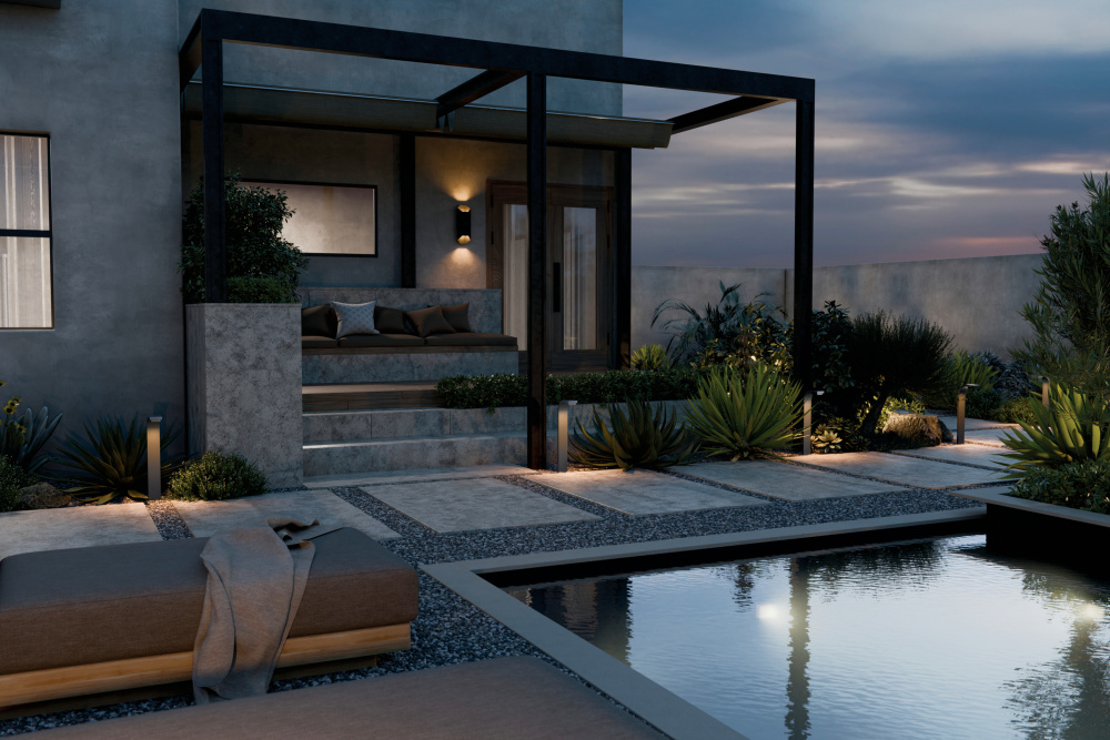 Its contemporary design blends seamlessly with nature while spotlighting the surrounding exterior style
