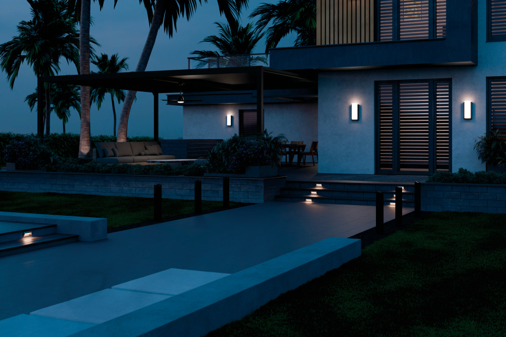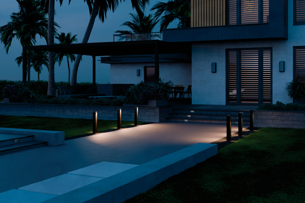 Its contemporary design blends seamlessly with nature while spotlighting the surrounding exterior style
