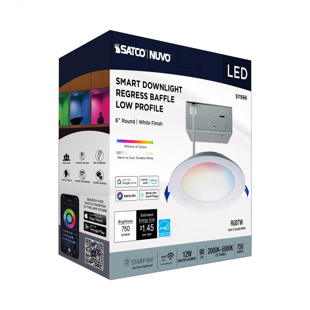 12 Watt; LED Direct Wire; Low Profile Regress Baffle Downlight; 6 Inch Round; Starfish IOT; Tunable White and RGB; 120 Volt; 90 CRI; White Finish