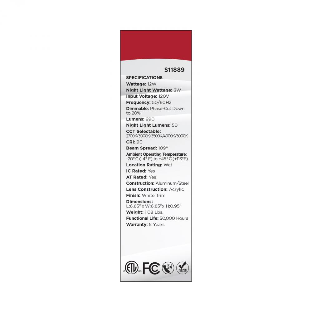 SATCO NUVO's LED 6-inch Square Downlights with Integrated Night Light provide a classic downlight with night light for additional ambiance control. Choose from five warm to cool CCTs at installation, connect an optional dimmer, or switch on-off-on at t