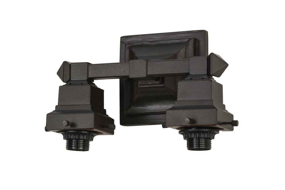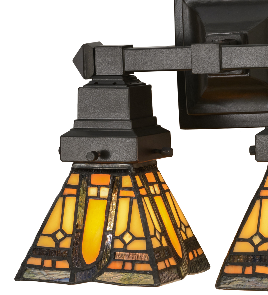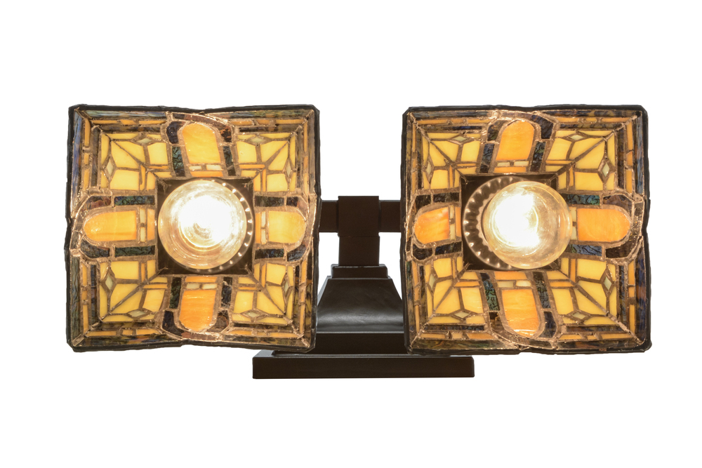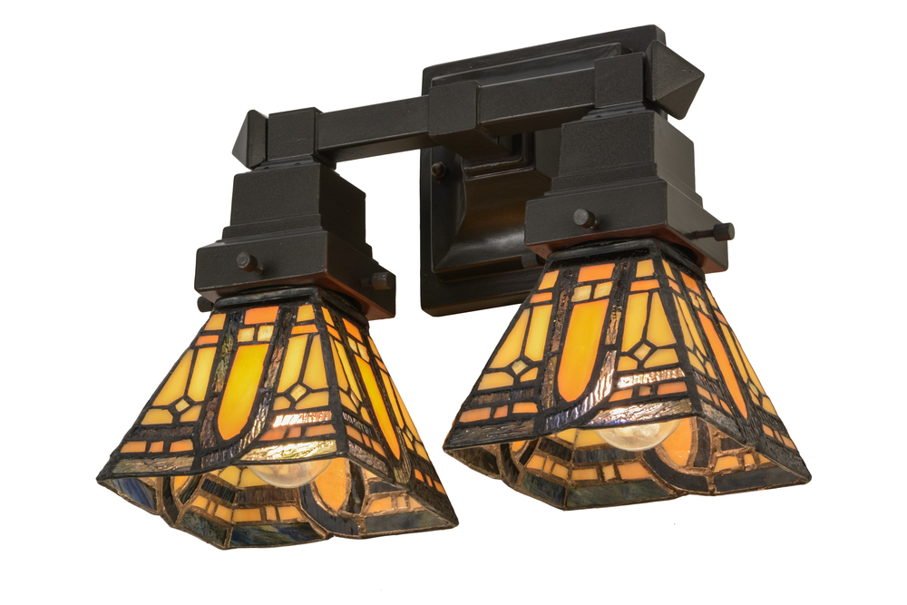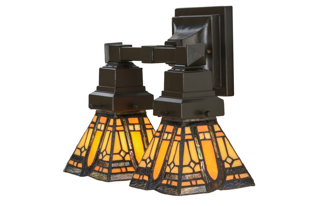 A powerful design statement fueled by strong lines and a simple geometric design; this wall sconce offers 2 art glass shades featuring Beige and Honey Tones accented with multicolored Ripple glass. Brilliant stained glass; appealing Mission styled shades and old world hardware finished in a Mahogany Bronze hue are fashioned into a handsome lighting fixture. The art glass shades are constructed using the famous Meyda Tiffany copperfoil construction process. The fixture can be used as a vanity light in a bath or a sconce in any other room. Custom sizes; colors; designs and dimmable energy efficient lamping options are available. UL and cUL listed for damp and dry locations.