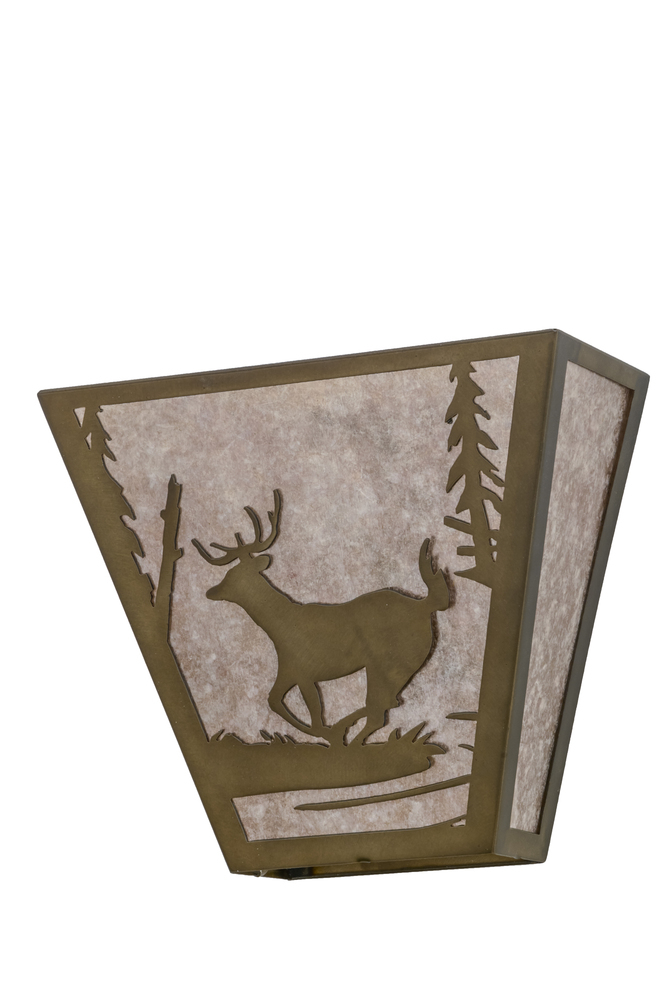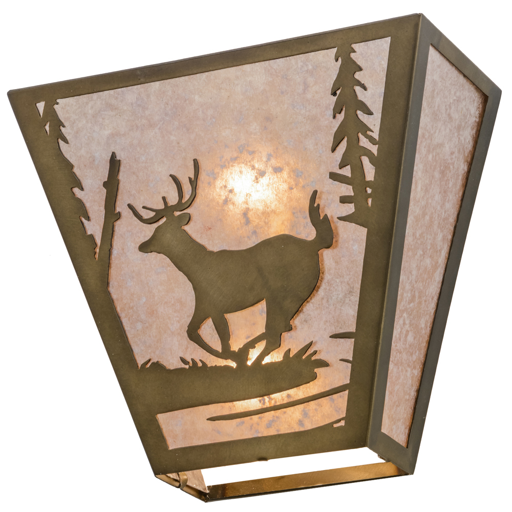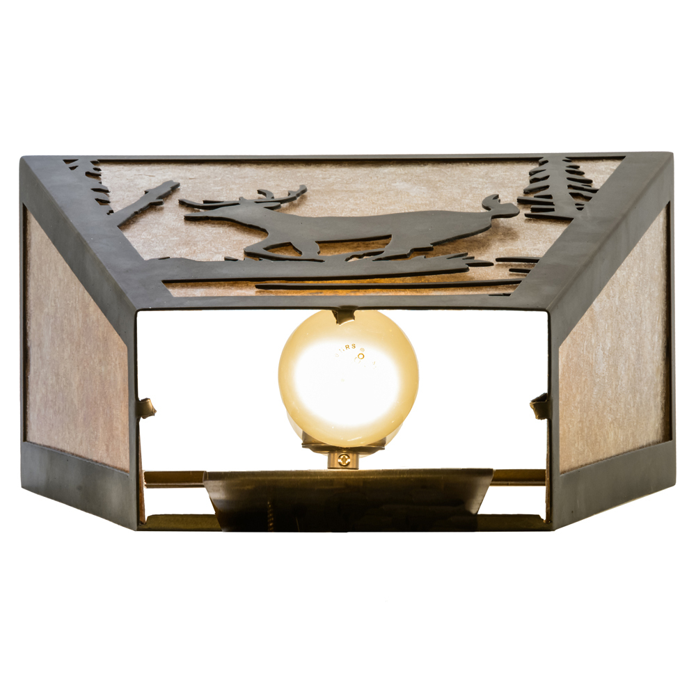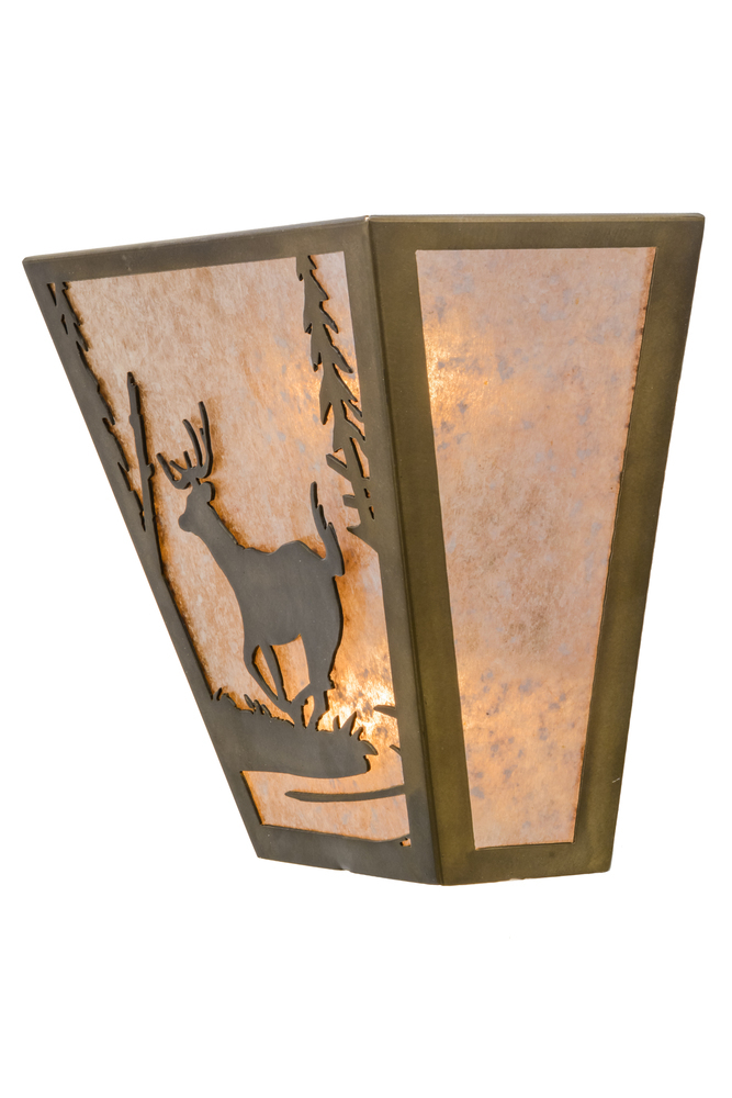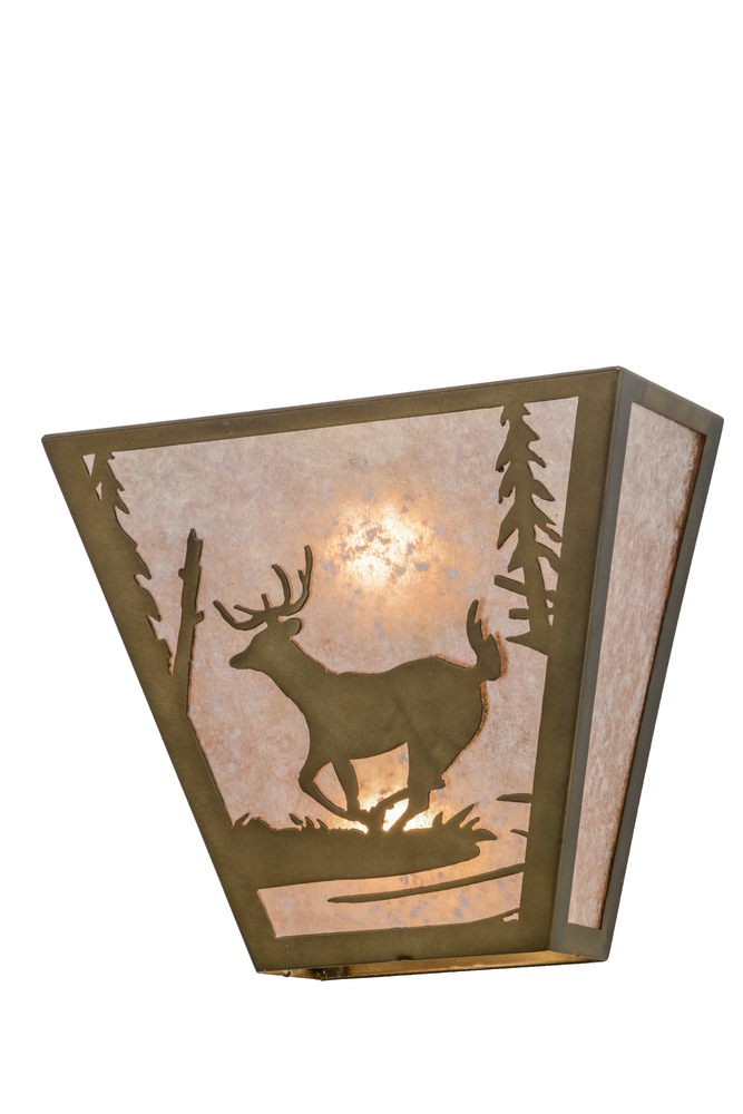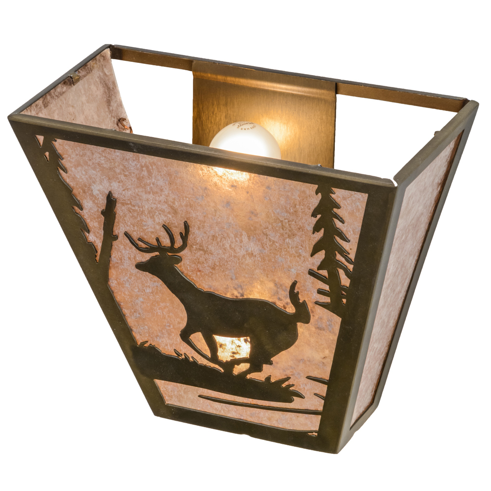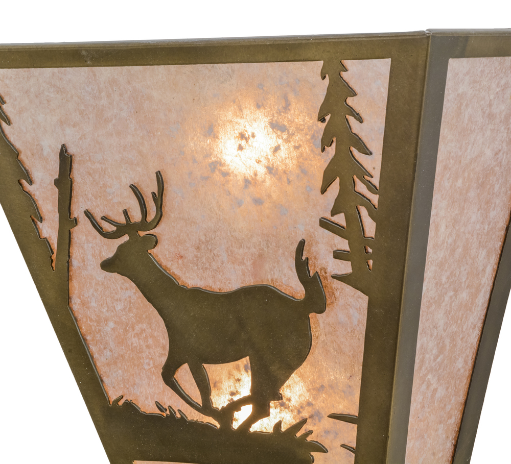 A stunning design depicts a Deer gracefully leaping through the lakeside woods as soft ambient illumination shines through Silver Mica. Use in pairs to mark important rooms or place in rows to line a hallway or exterior. Hardware and accents are finished in Antique Copper by Meyda artisans in our facility at the foothills of the Adirondack Mountains.