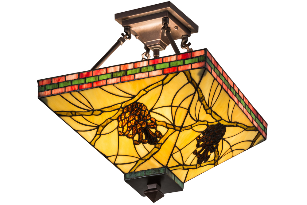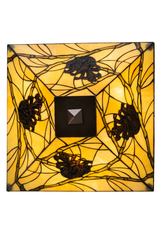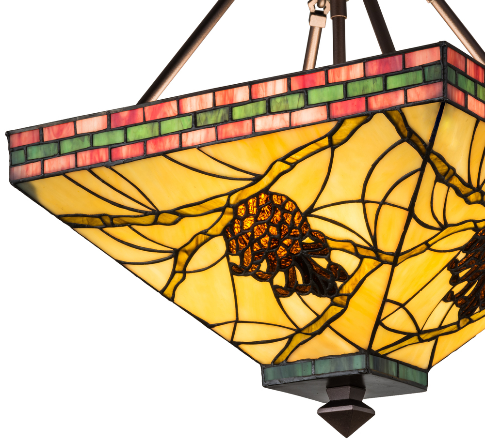 This stunning design features the iconic pinecone; one of Mother Nature's most compelling organic symbols; which offers a natural elegance and represents the evolution of human enlightenment. Burgundy and Leaf Green bands edge this woodland art glass shade that highlights Bark Brown pinecones and branches on a Golden Sun background. The shade is created using the famous Meyda Tiffany copperfoil construction process. Custom styles; colors; sizes and dimmable energy efficient lamping options are available. UL and cUL listed for damp and dry locations.