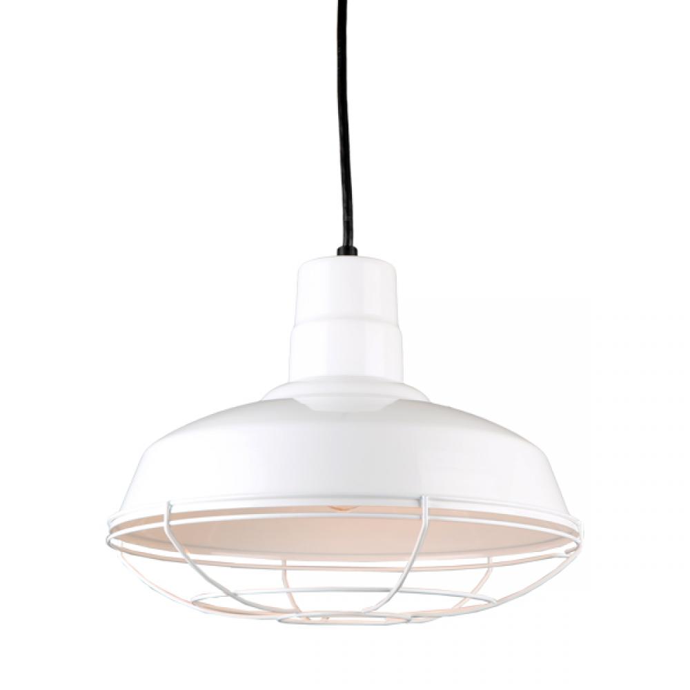 Our Cord-Hung Warehouse Shade # H-15114 measures 9 inches high by 14 inches wide. It is lamped using a 200-watt incandescent light bulb. Available shade finishes include Black (91), White (93), Galvanized (96), and Oil Rubbed Bronze (145). Black cord measures 8-feet long. Optional wire guard accessory available.