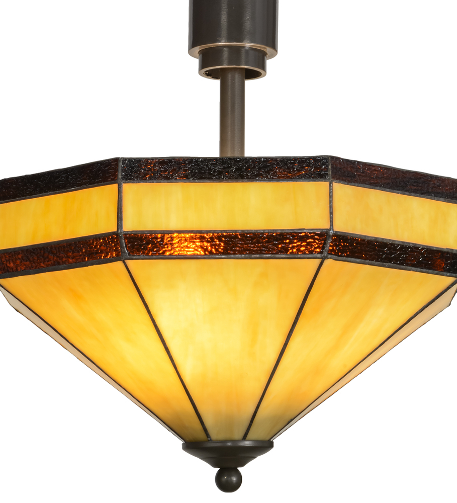 Inspired by Marjorie Merriweather Post's retreat in Paul Smiths; New York; outside of Lake Placid where the 1932 and 1980 Winter Olympics were held. The original chandelier was installed in the Main Lodge in the vacation camp built in 1923. This stunning fixture features Beige art glass with Root Beer colored trim suspended by a decorative multi-cylindrical support and hardware finished in Timeless Bronze. Handcrafted using Meyda Tiffany?s famous copperfoil construction process.
