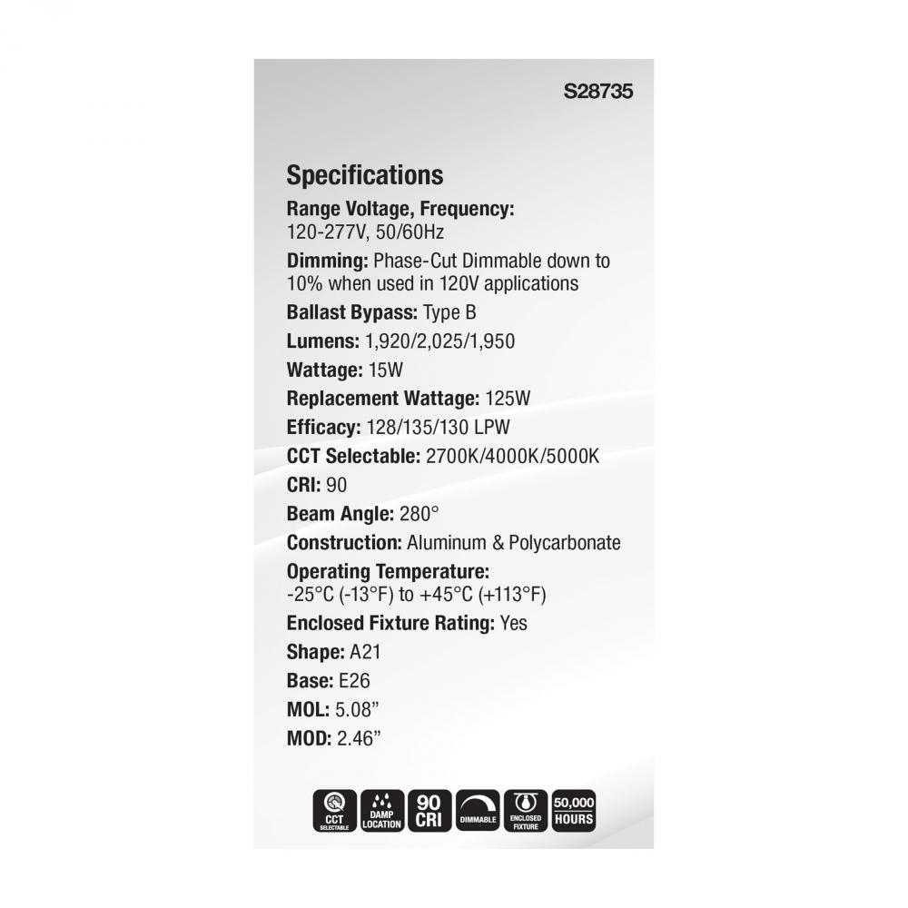 15 Watt LED A21; High Lumen Output; 27K/40K/50K CCT Selectable; Medium Base; White Finish; 120V-277V