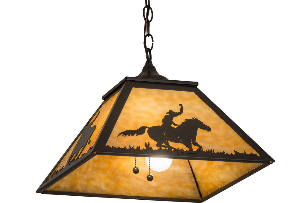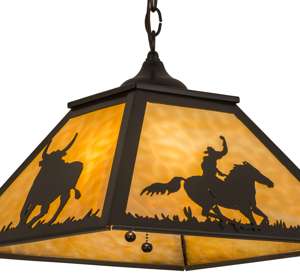 A cowboy riding his trusty horse is depicted chasing steer across the prairie as the sun shines brightly at high noon in this western inspired ceiling fixture design. Warm ambient light projects through alluring Beige art glass; which is complemented by accents and hardware featured in a Timeless Bronze finish. Handmade in the USA; this fixture is handcrafted by Meyda artisans in our manufacturing facility in the USA. Custom colors; sizes and styles are available; as well as dimmable energy efficient lamping options.