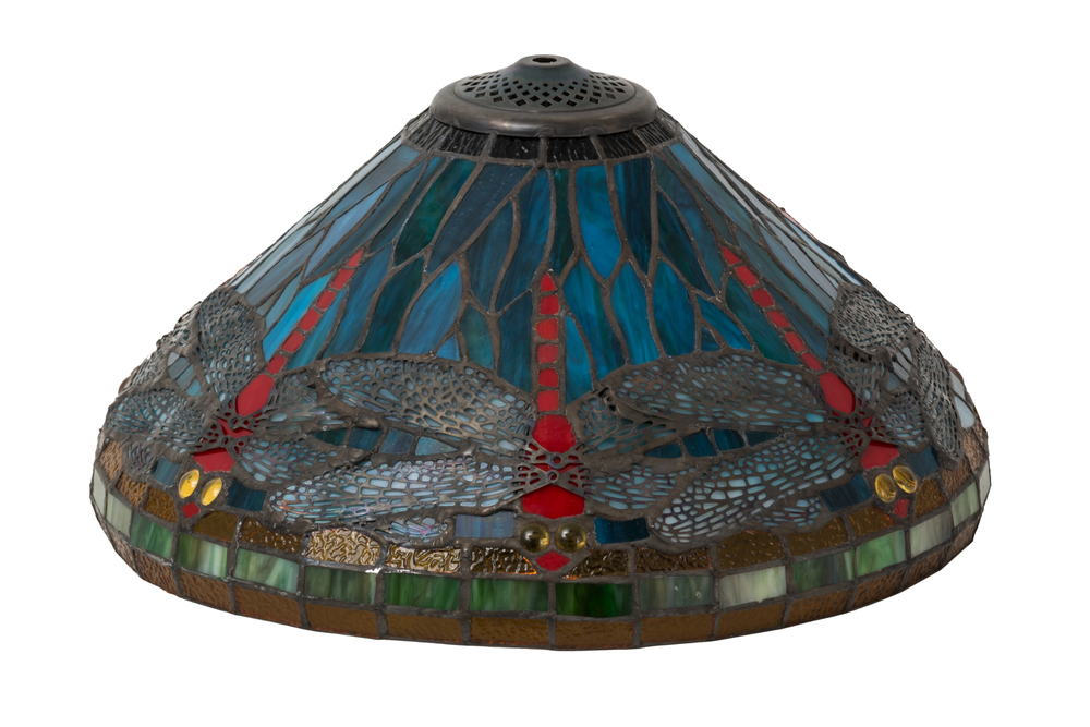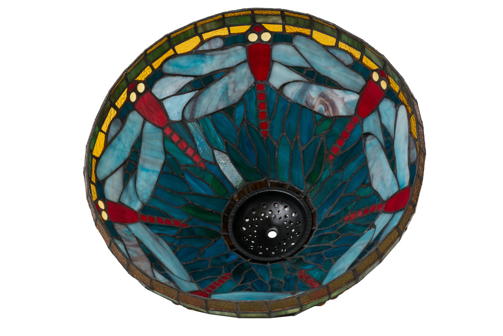 This version of Tiffany Studio's most beloved dragonfly design is modeled after the original stained glass dragonfly. Diving Scarlet Red dragonflies with jeweled eyes and delicate metal filigree wings circle over hand cut and copper foiled pieces of Sky Blue art glass. Sparkling Amber Granite Glass and Brown/Green Glass bands circle the bottom of the shade. The art glass shade is created using the famous Meyda Tiffany copperfoil construction. Ideal for embracing a base to create a gorgeous table/floor lamp or hardware to build a beautiful ceiling fixture. Each shade is a unique work of art with color variations based on natural ingredients inherent in the glass. Contact us if color matching is critical when ordering multiple items.