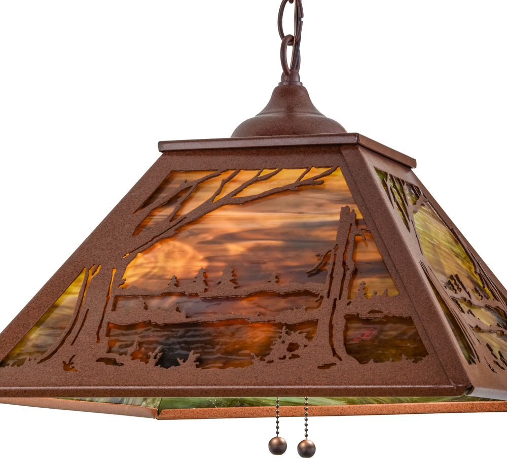 A reflection on simple living in natural surroundings; this Craftsman styled steel pendant features a woodland pond setting as beautiful ambient light shines through Woodsy Green art glass and is complemented with a Rust finish. Inspired by the Arts & Crafts Movement; the fixture is handmade by Meyda artisans at the foothills of the Adirondack Mountains in the USA. Custom sizes; colors and styles are available; as well as dimmable energy efficient lamping options.