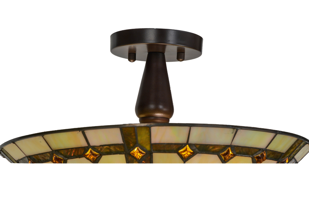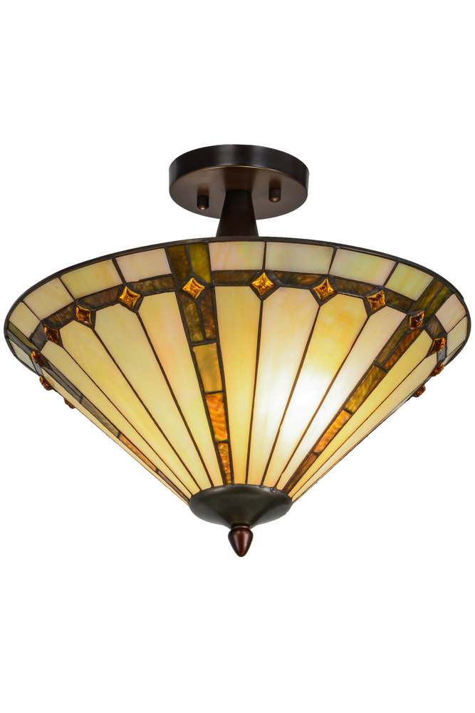 Exquisite Purple; Dark Green and Sunburst colored trim with Amber jewels adorn Beige Iridescent glass on this conical shade. This stunning shade is constructed with Meyda Tiffany's famous copperfoil construction process. The hardware is finished in a warm Mahogany Bronze.