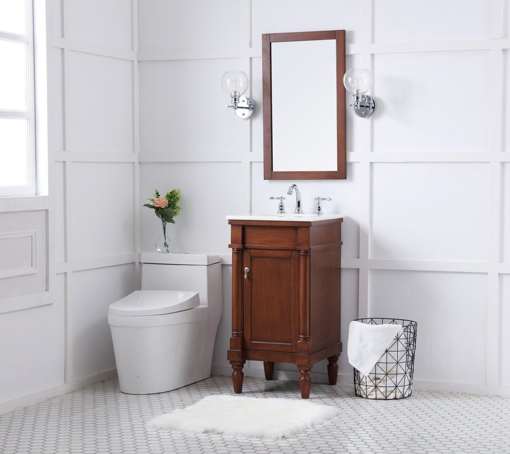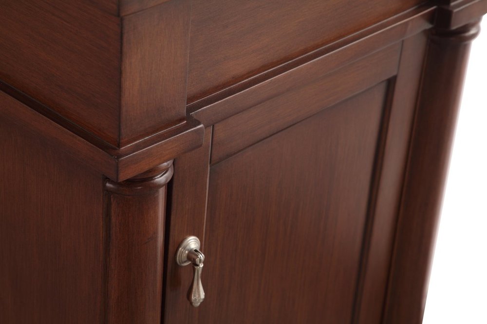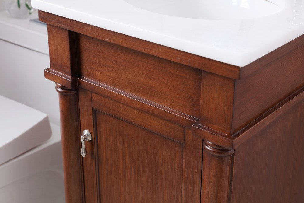 This traditionally styled, yet fashionably designed vanity can add distinction and grace to your home or office bathroom. Beautifully combining a lustrous white marble countertop with an oval white porcelain under-mount sink and a hand-painted walnut Single door cabinet with a shelf inside, brushed steel door pulls, standing on turned, tapering legs. You’ll enjoy its charming allure for many years to come. Measurements: W18” x D19” x H35”