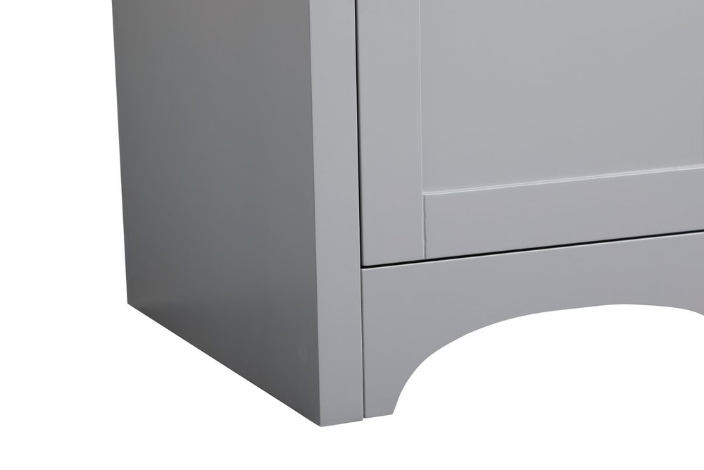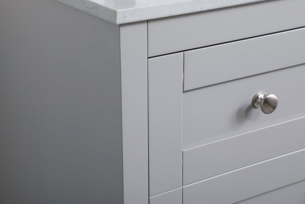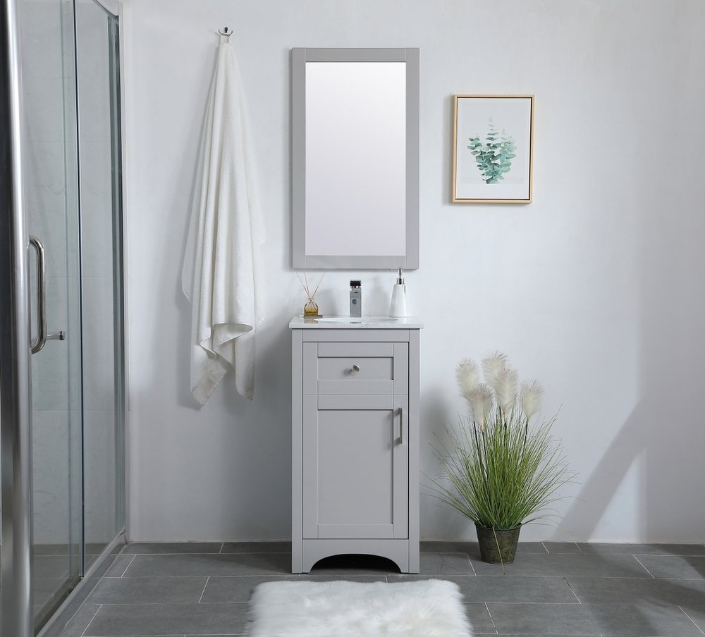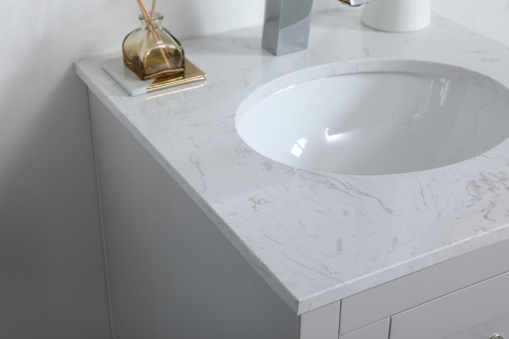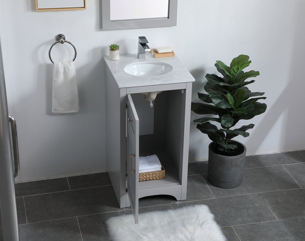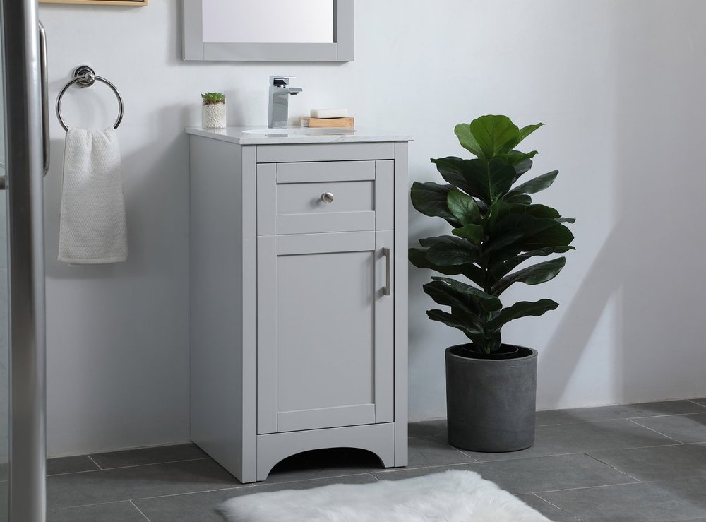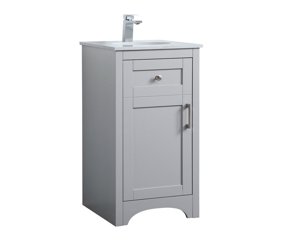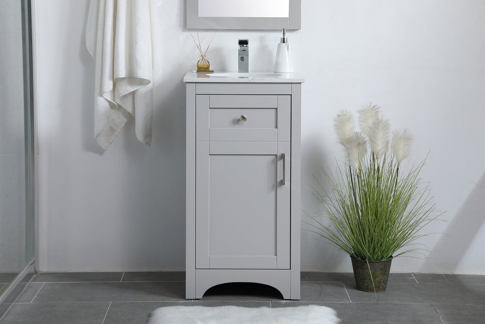 The refined simplicity of this 18" grey finish vanity creates a peaceful, yet stylish, atmosphere. Its traditional modernity adds a mature beauty that will elevate any bathroom or powder room--the Calacatta engineered marble counter top adds refined luxe while the brushed nickel handle bars open the Single cabinet door, revealing ample storage space to store and hide away an assortment of bathroom essentials. Whether your home is large or small, this vanity will surely fit in well.