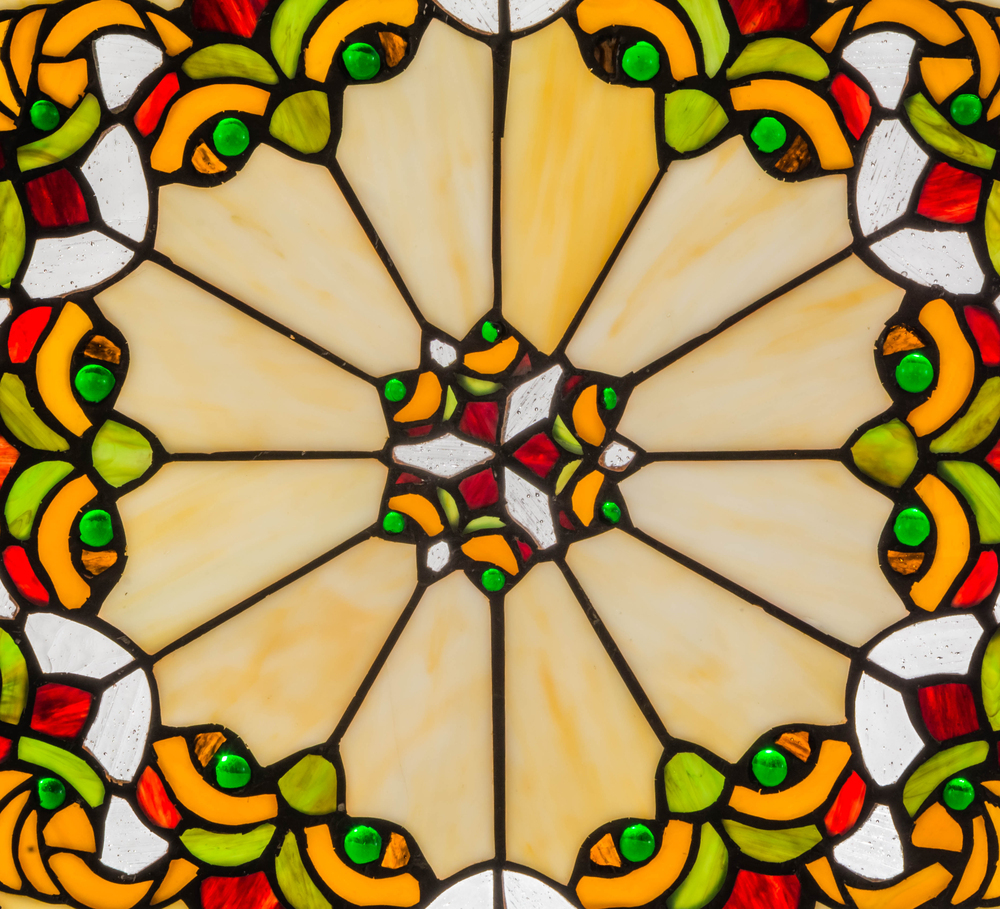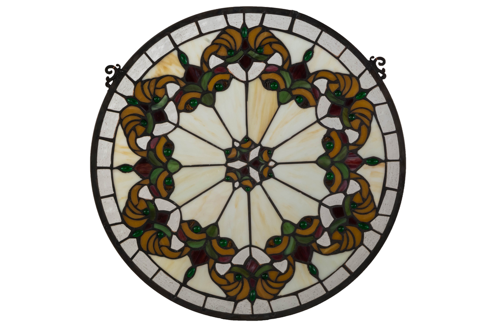 Victorian charm in beautiful stained glass; for an elegant decorative look; best describes Middleton. French styled abstract floral and scroll motifs are displayed in Ruby Red; Leafy Green and Saffron; accented with Emerald colored glass jewels; on a Soft Cream background with Clear glass trim. This round stained glass window was created using Meyda Tiffany?s famous copperfoil construction process and enhanced by an Antique Brass finished frame. The window is ideal for placement in a standard window opening in any room where you want to make a design statement. Mounting brackets and hanging chain are included.