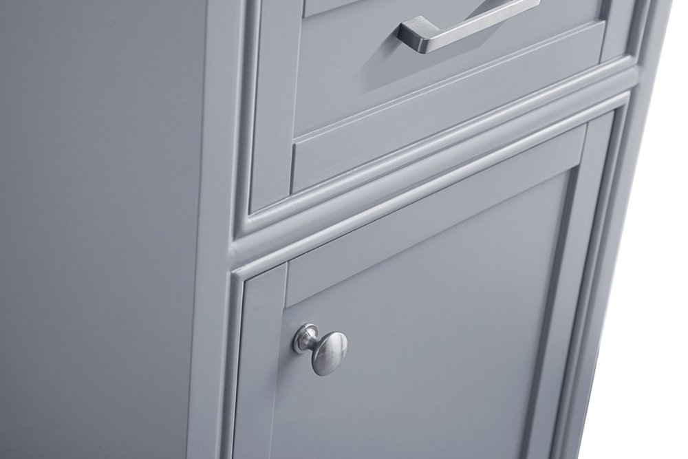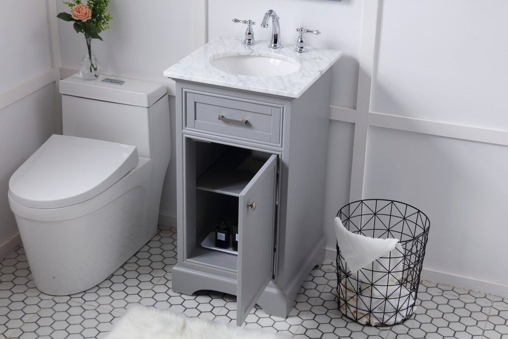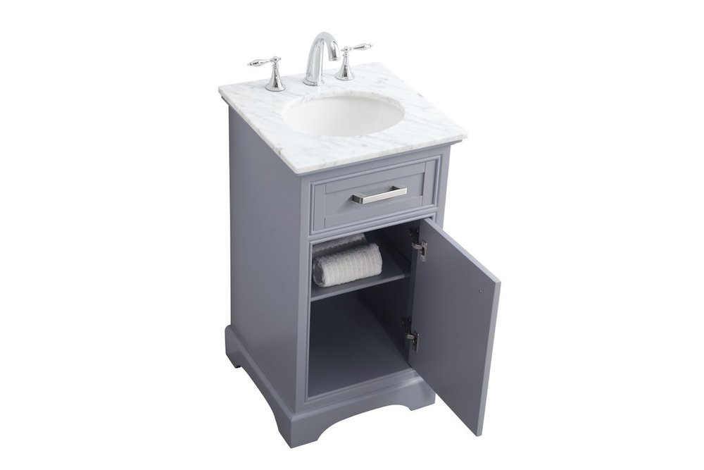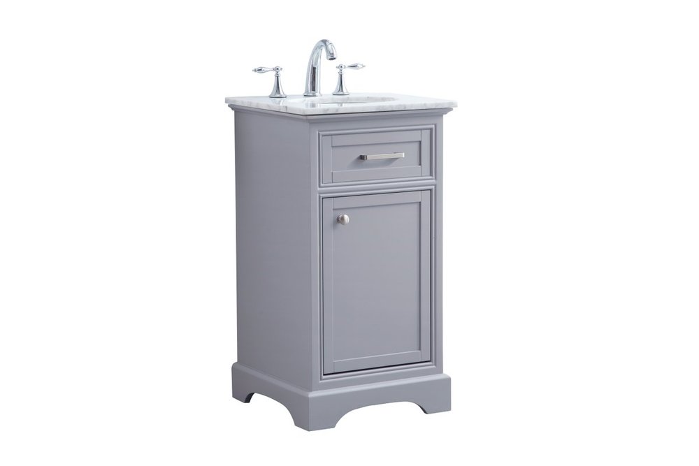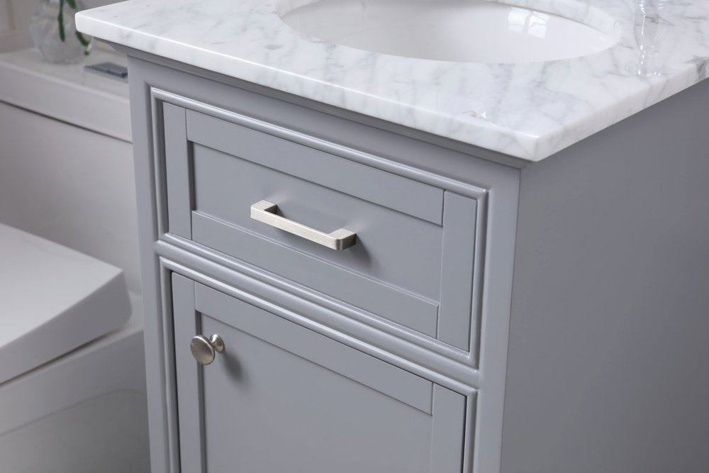 From its Italian Carrara white marble top to its contemporary-styled hand painted Soft grey cabinet, it is sure to enhance either your home or office bathroom. Beneath its lustrous, natural marble top and oval, white porcelain under-mount sink, a handsome Single door cabinet with a shelf inside for all your bathroom essentials, highlighted with recessed panel doors, brushed steel bar handle and knobs, stands on a strong solid base . A wonderful balance of simplicity and practical function! Measurements: W19”xD19”xH35”
