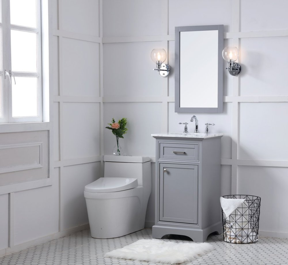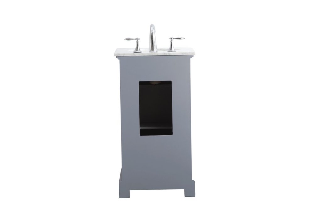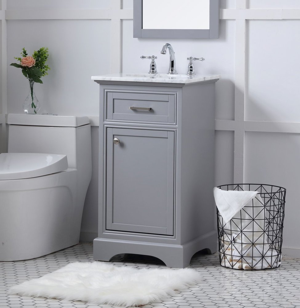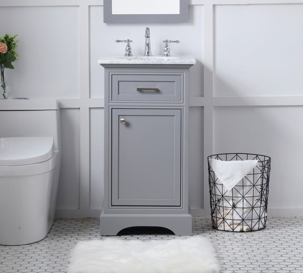 From its Italian Carrara white marble top to its contemporary-styled hand painted Soft grey cabinet, it is sure to enhance either your home or office bathroom. Beneath its lustrous, natural marble top and oval, white porcelain under-mount sink, a handsome Single door cabinet with a shelf inside for all your bathroom essentials, highlighted with recessed panel doors, brushed steel bar handle and knobs, stands on a strong solid base . A wonderful balance of simplicity and practical function! Measurements: W19”xD19”xH35”
