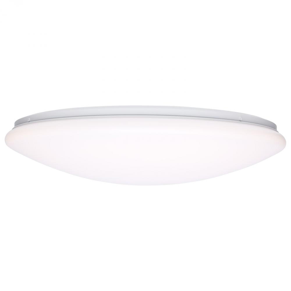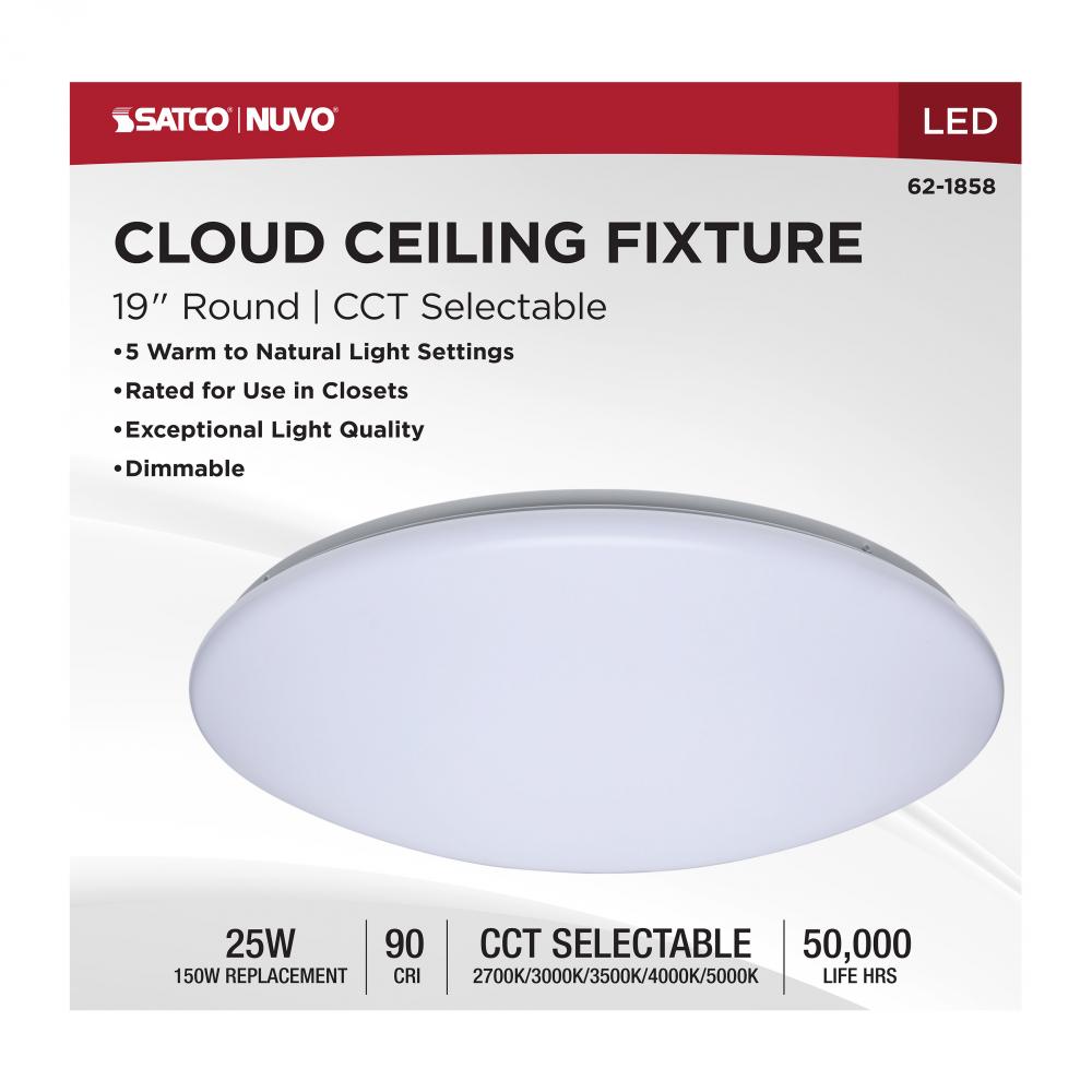 The SATCO NUVO 62-1858, 19-inch round LED Cloud fixture features 5 CCT selectable technology and a high 90 CRI rating, ensuring exceptional and uniform illumination. It is crafted with a durable, non-yellowing PMMA lens and is rated for damp locations, mak