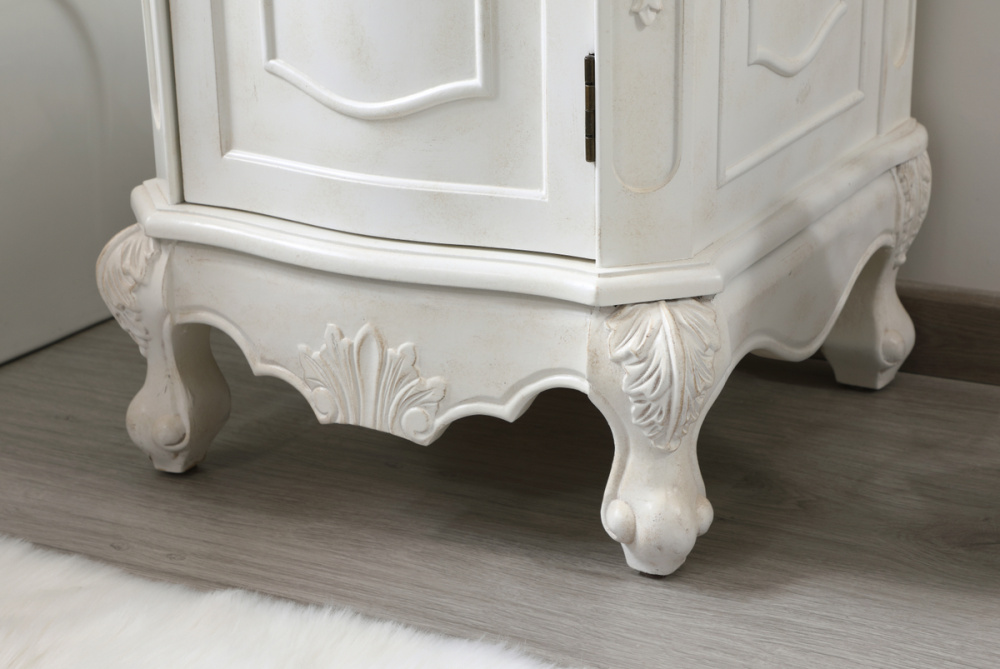This superb balance of timeless tradition and opulent beauty in a engineered marble-topped vanity will certainly enhance the aesthetics of any home or office bathroom! Featuring an ivory white durable engineered marble countertop complimenting the hand painted cabinet with a delicate carved floral design, stands on stylishly carved solid wood French scroll feet. Don't let the design fool you, the engineered marble countertop and porcelain undermount sink allows for space to get ready, while the antique bronze hardware allows you to discover storage spaces with ease. You and your guests will marvel at this vanity that will both store away your bathroom essentials and enhance the aesthetics of your room.