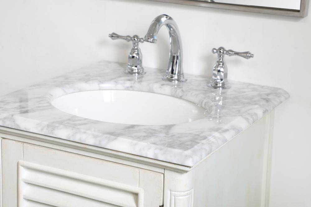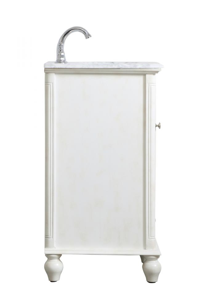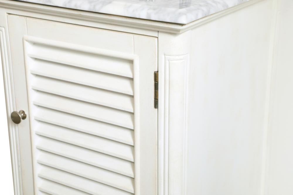 Distressed antique white finish with a luxurious carrara white marble countertop