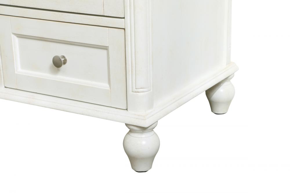 A small space doesn't mean you have to settle for less. The Rhodes collection compact vanity in an antique white finish will add lovely sophistication and complement any small bathroom or powder room, while utilizing its charm and function to provide you with ample storage spaces. Brushed nickel knobs gently adorn the shuttered cabinet door and drawer at the base, allowing for you to store away your bathroom essentials. The Carrara white marble countertop, porcelain undermount sink, dignified subtle engravings on the side edges, and rounded legs all come together to create contemporary beauty. Work with your space, and design a beautiful room, no matter the size.