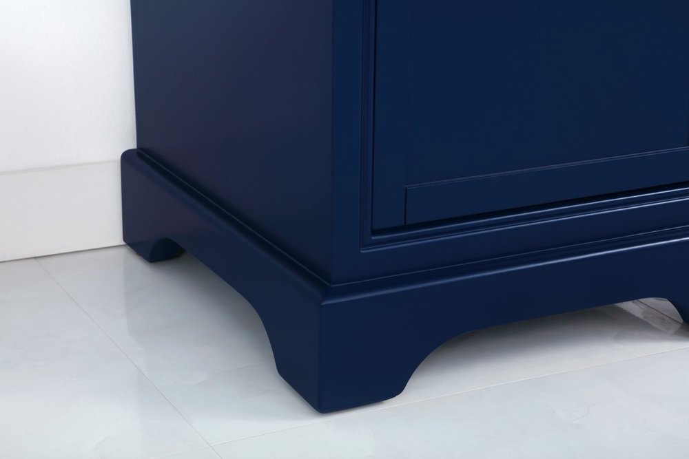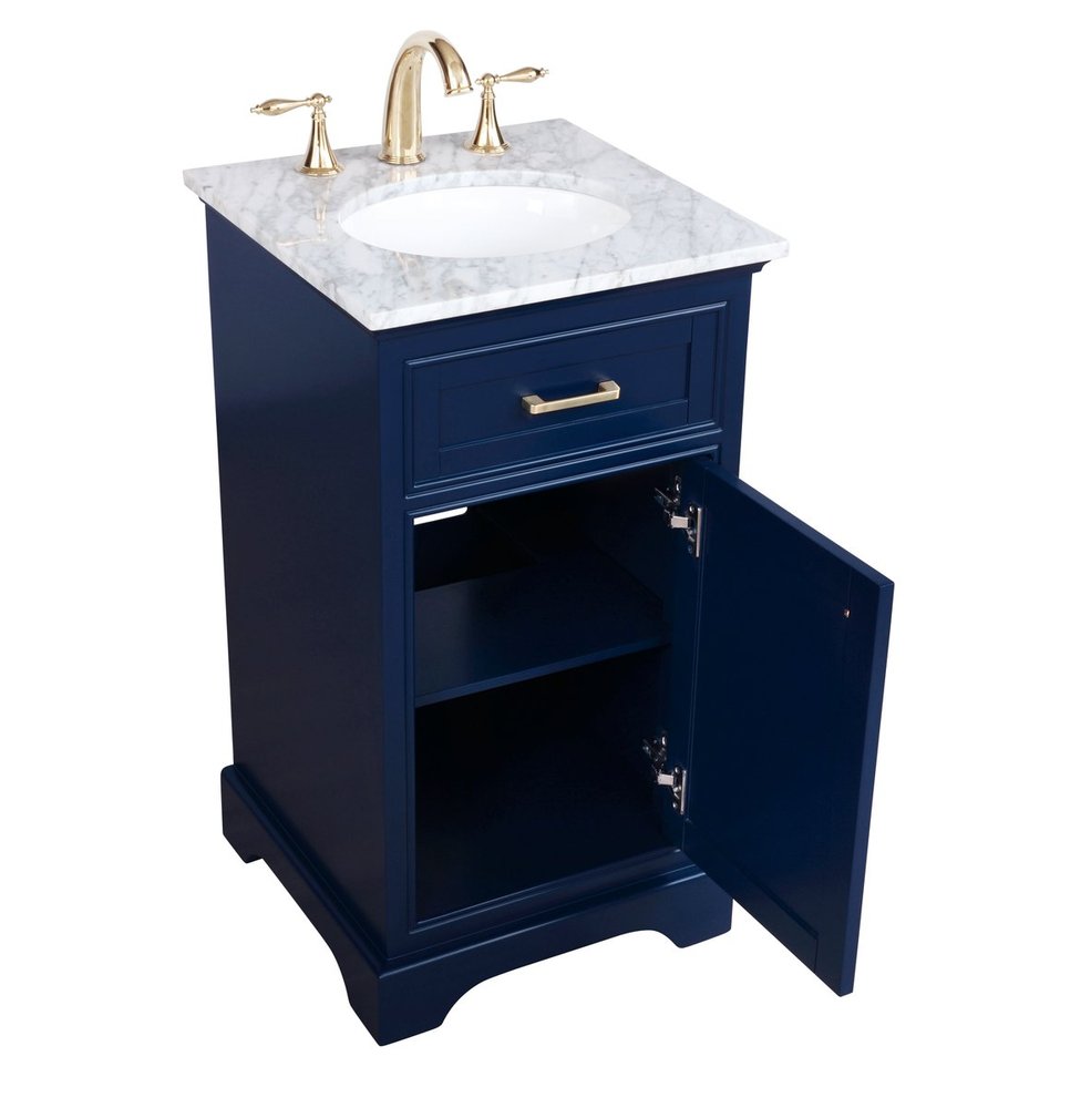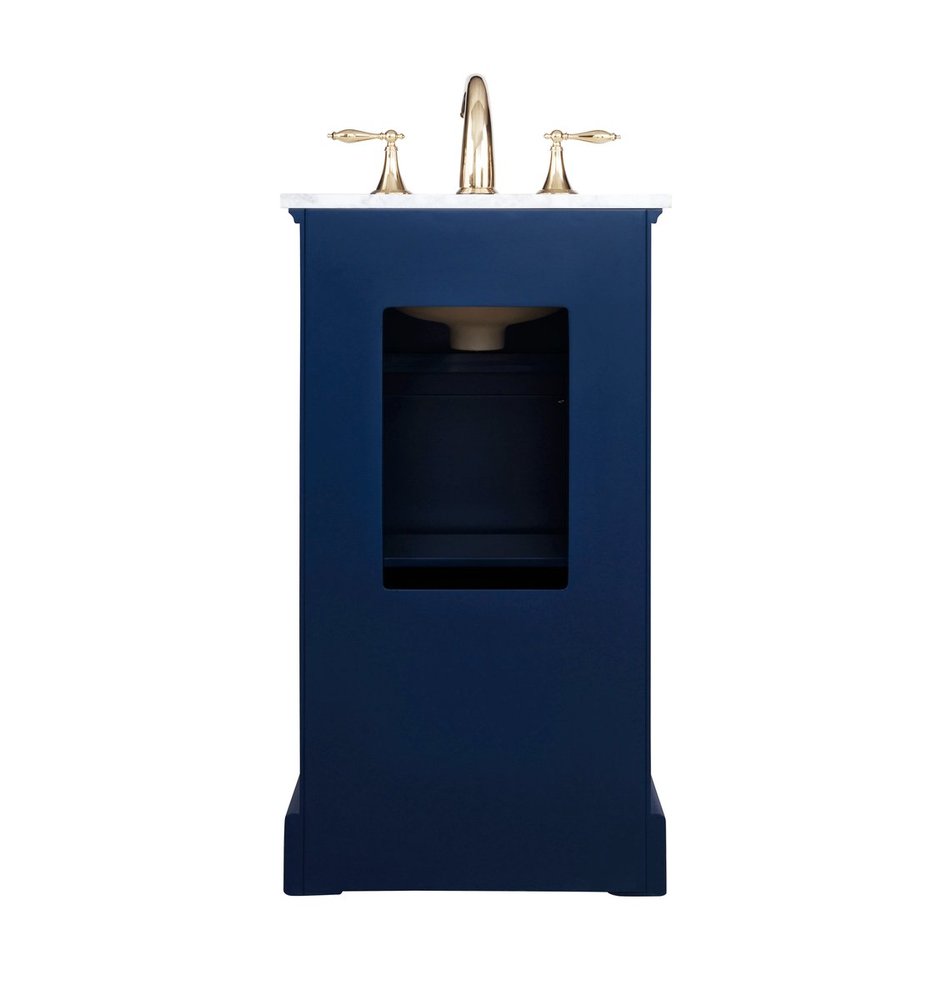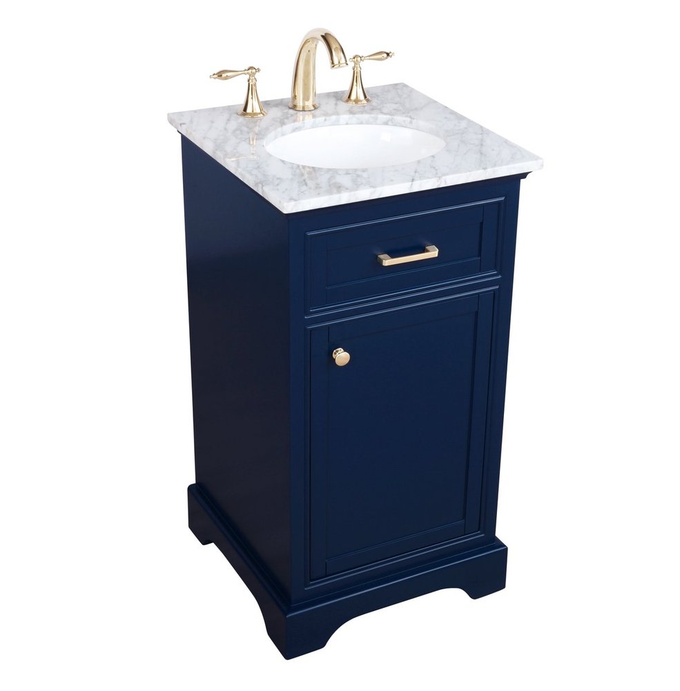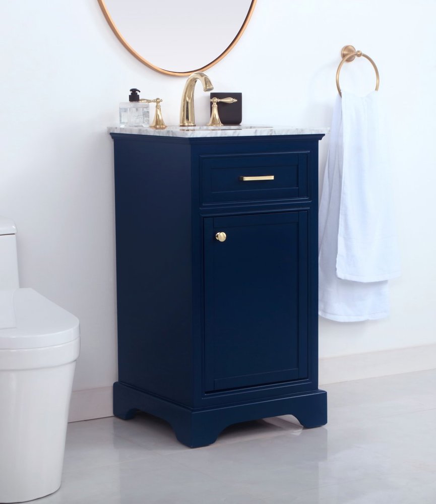 From its Italian Carrara white marble top to its contemporary style hand-painted blue cabinet, this member of our “Americana” vanity collection is sure to enhance either your home or office bathroom. Beneath its lustrous, natural marble top and oval, white porcelain under-mount sink, a handsome Single door cabinet with a shelf inside for all your bathroom essentials, highlighted with recessed panel doors, brushed gold bar handle and knobs, stands on a strong solid base. A wonderful balance of simplicity and practical function! Measurements: W19”xD19”xH35”