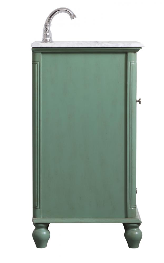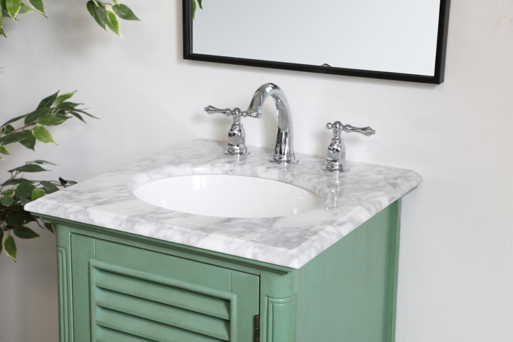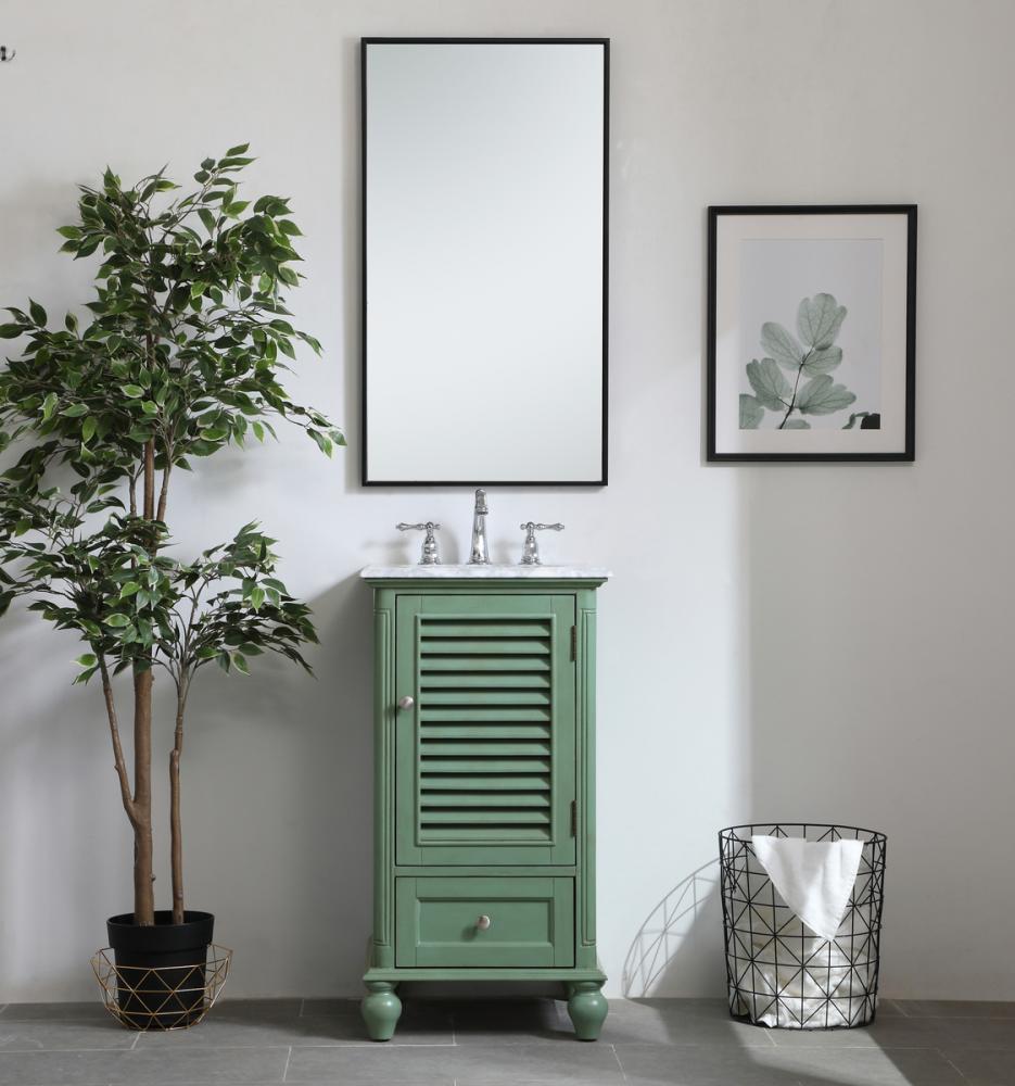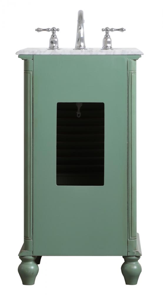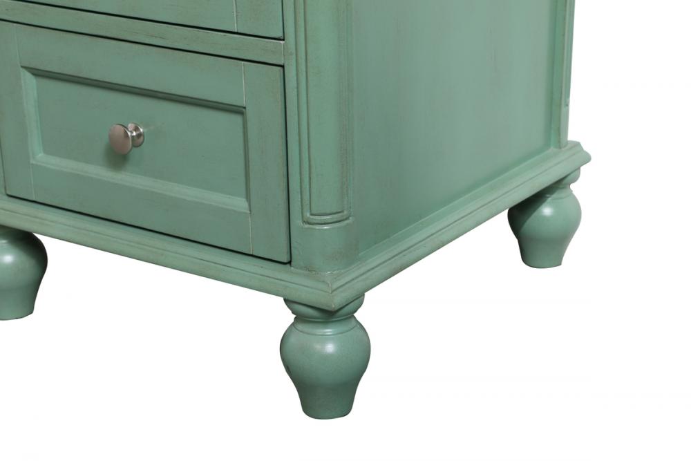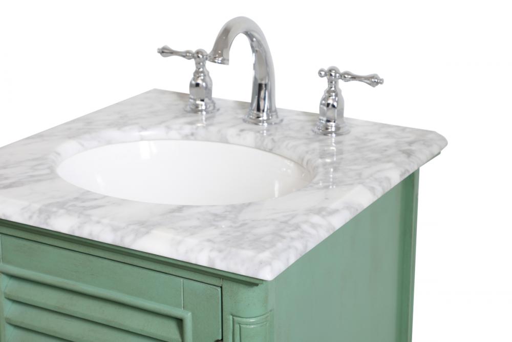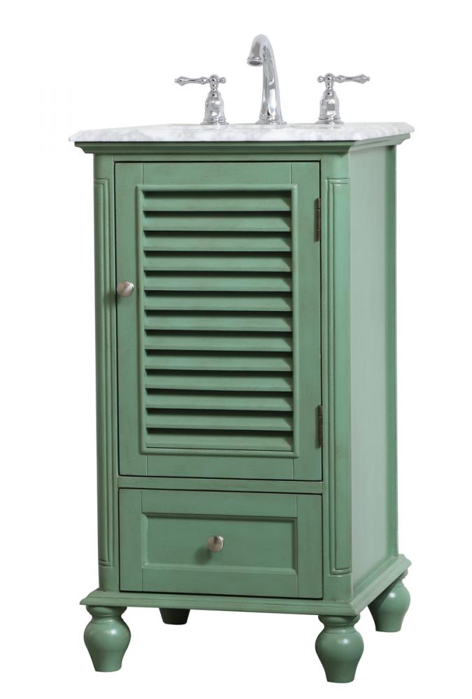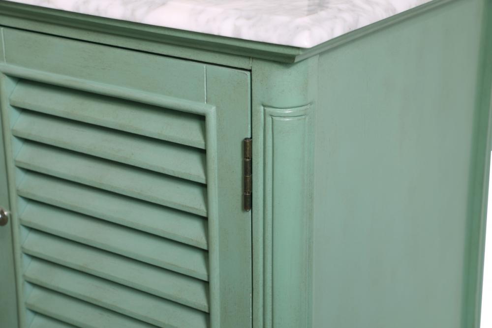 A small space doesn't mean you have to settle for less. The Rhodes collection compact vanity in a vintage mint finish will add a lovely splash of color and complement any small bathroom or powder room, while utilizing its charm and function to provide you with ample storage spaces. Brushed nickel knobs gently adorn the shuttered cabinet door and drawer at the base, allowing for you to store away your bathroom essentials. The Carrara white marble countertop, porcelain undermount sink, dignified subtle engravings on the side edges, and rounded legs all come together to create contemporary beauty. Work with your space, and design a beautiful room, no matter the size.
