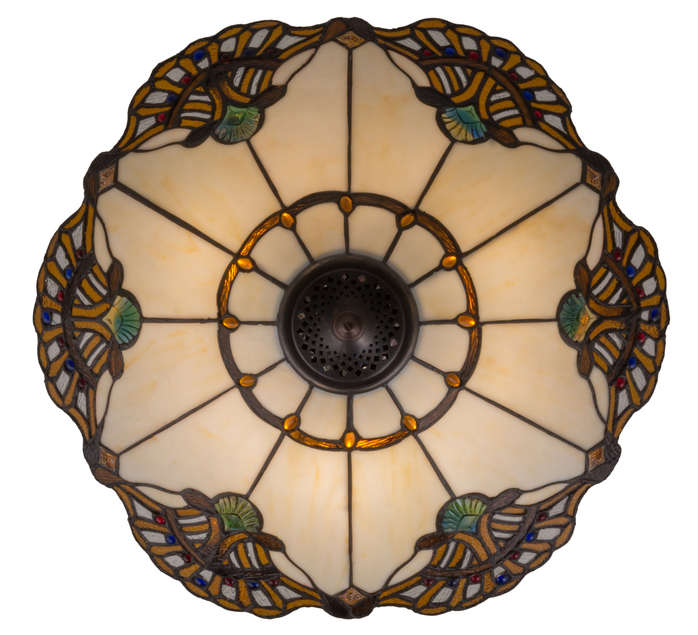 The Honey Locust was popular floral design created by Louis Comfort Tiffany; more than a century ago. Decorative dome-shaped stained glass lampshades; with petal shaped edges depict clusters of Plum and Periwinkle flowers amid Spring Green leaves cascading towards the base. This Desk Lamp has complementary decorative hardware featuring Mahogany Bronze finish.