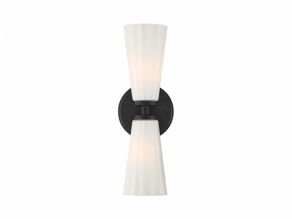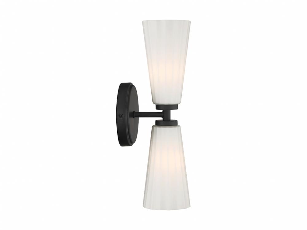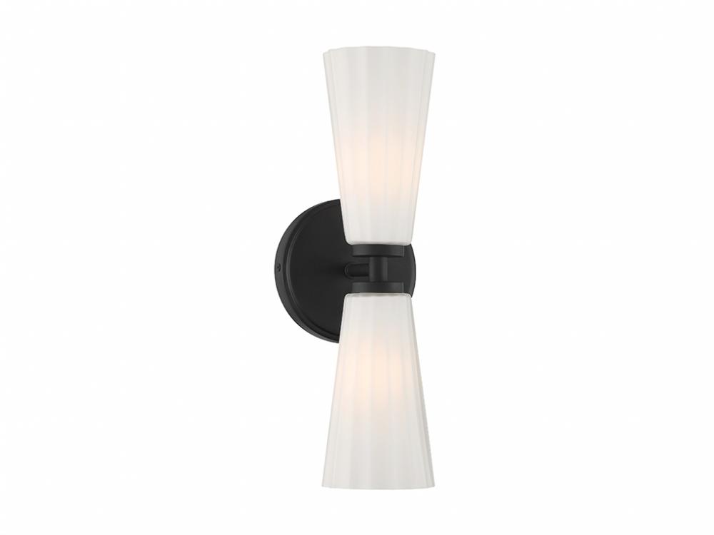Timelessly beautiful and elegant, this 2-light sconce is sure to brighten your home in style. Its alluring white fluted glass shades add a thoughtful touch of texture and pair nicely with the Matte Black finish. The height is 14.5", the width is 5.125" and it extends 5.5" from the wall. Uses 2 candelabra size bulbs of up to 60 watts per bulb. Bulbs not included.