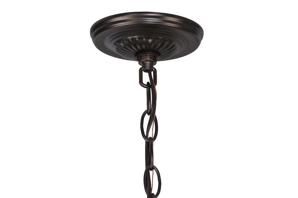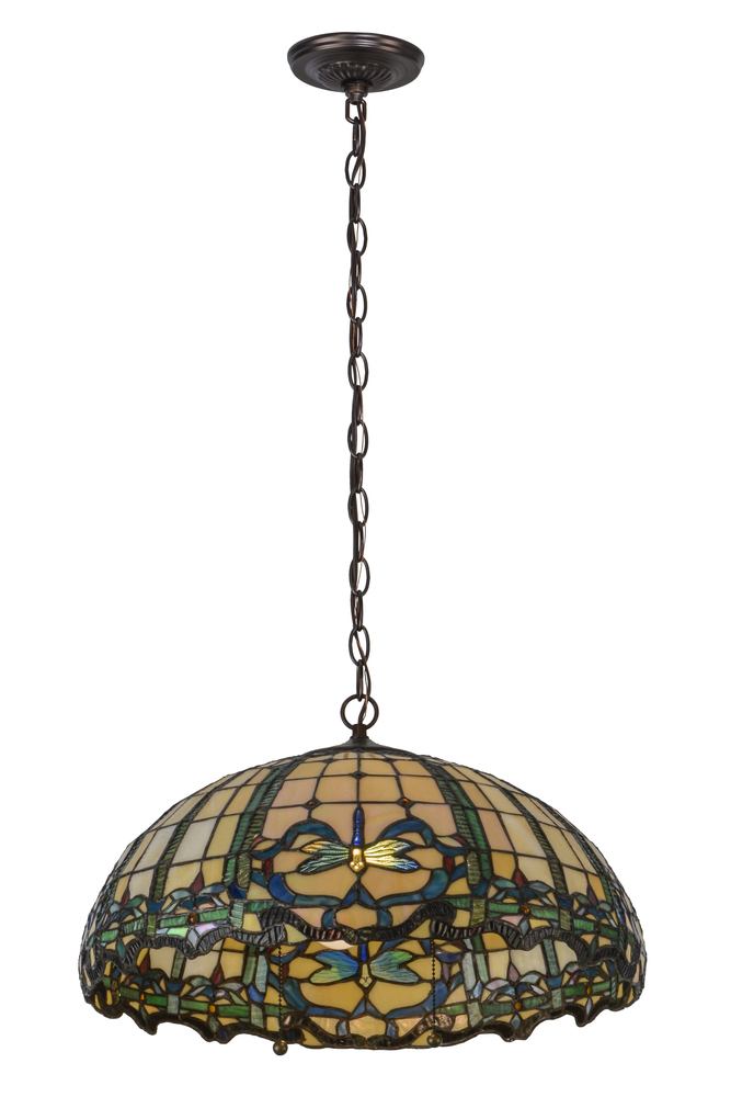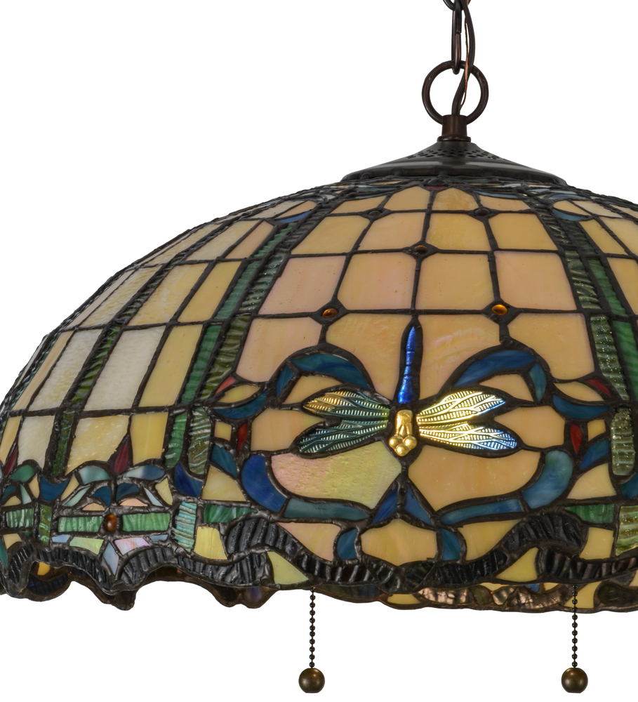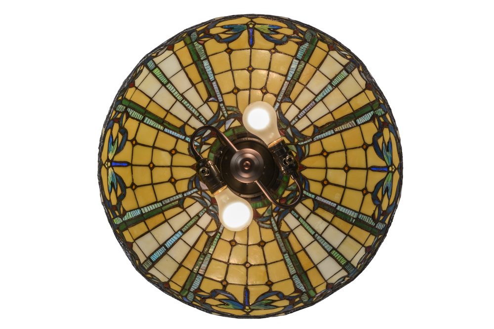 Tiffany?s beloved design recreated with a diving dragonfly as the focal point of this nouveau design in Blue/Green Ripple glass on a Bone Beige background; with Amber jewels and Ruby Red accents. The shade created with Meyda Tiffany?s famous copperfoil construction process.