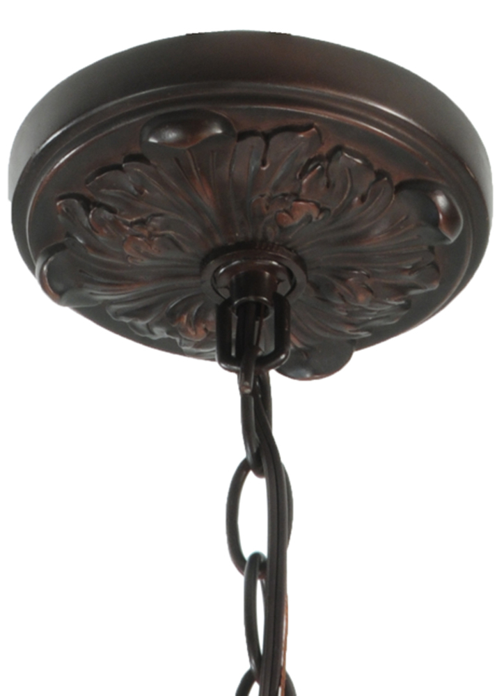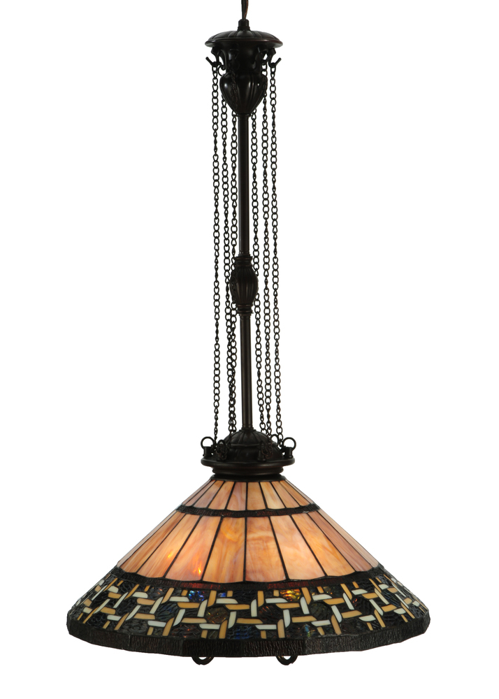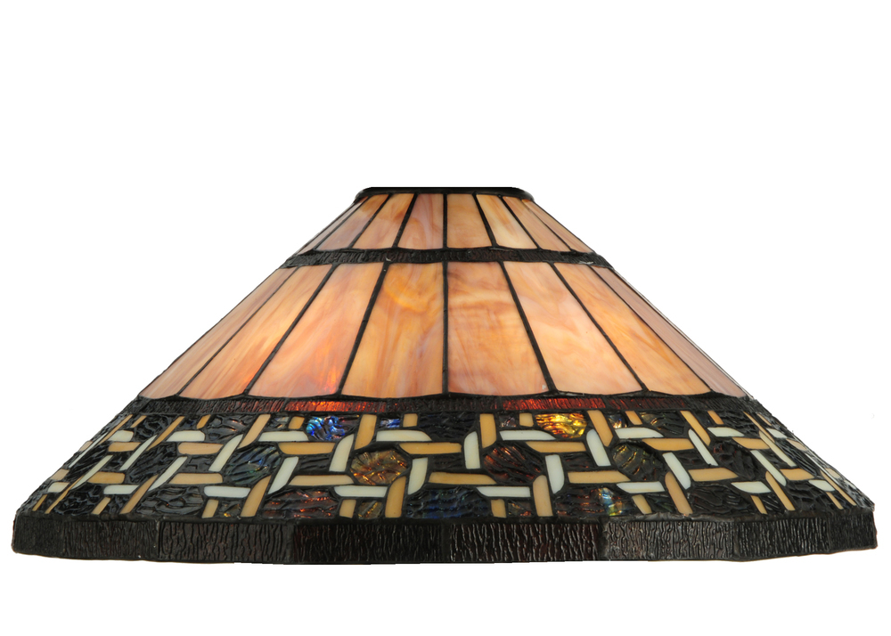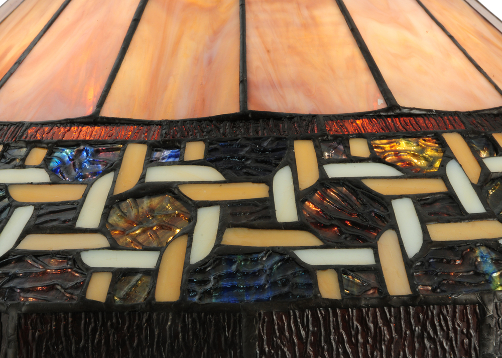Named for the Greek word for light; Ilona will stir conversations among family and friends with a dramatic Honey and Beige colored knotwork design on Wispy Blue/Green Rippled glass. The pendant's background includes Beige; Mauve and Purple art glass while Root Beer colored glass borders enhance the beauty of this exquisite art glass shade; which is created using Meyda Tiffany's famous copperfoil construction process. The hardware is finished in a warm Mahogany Bronze.