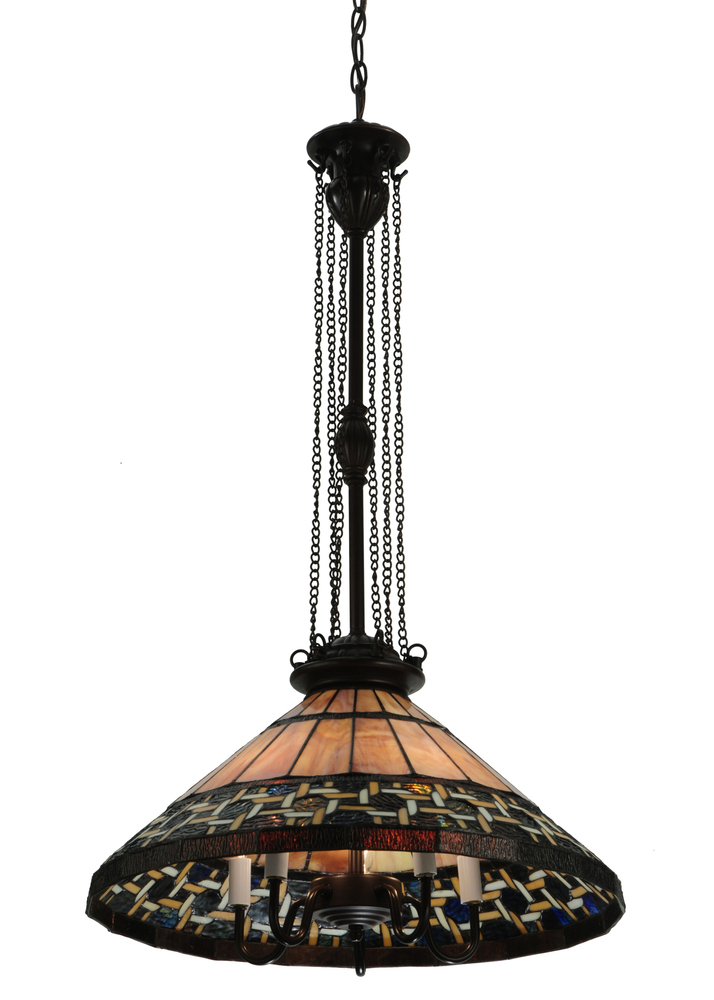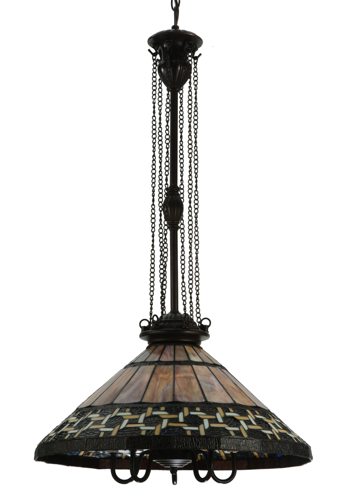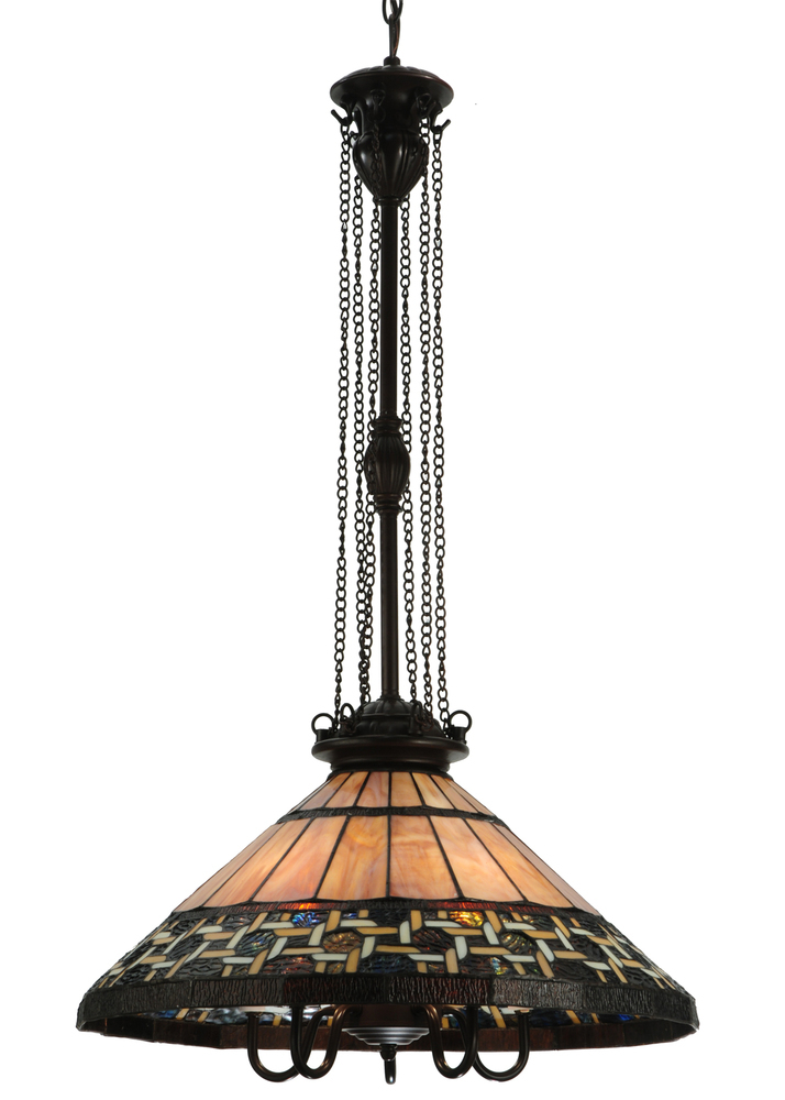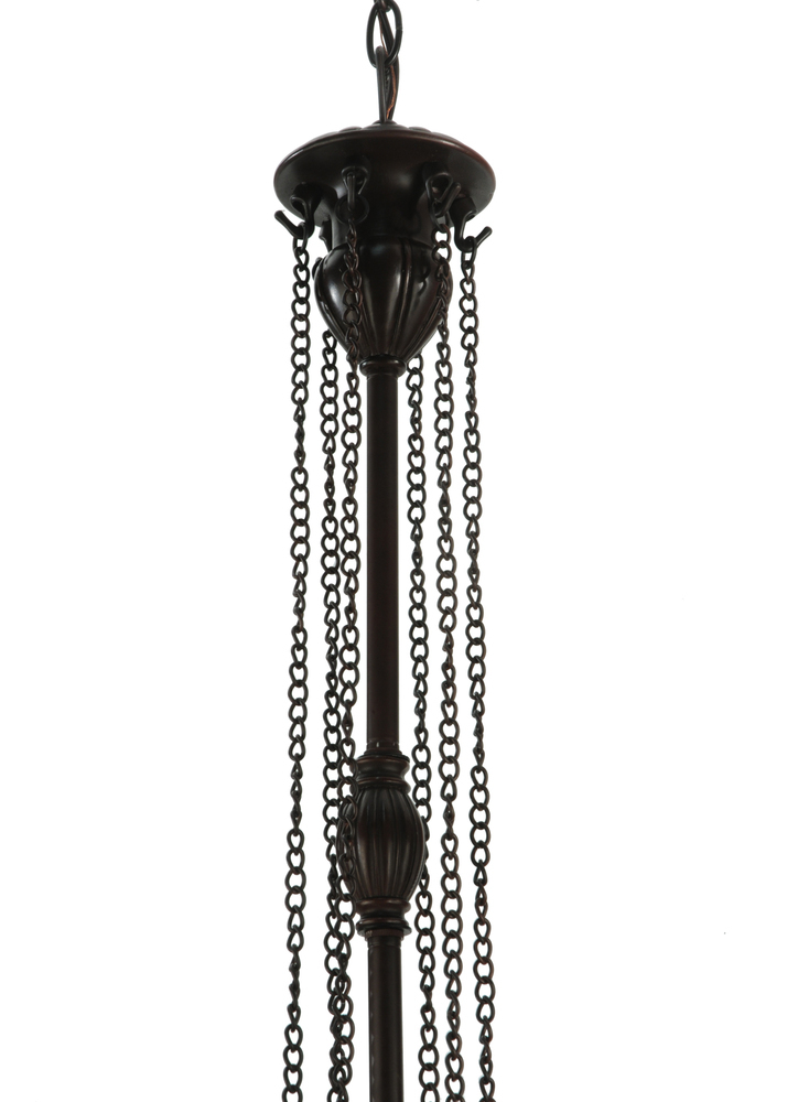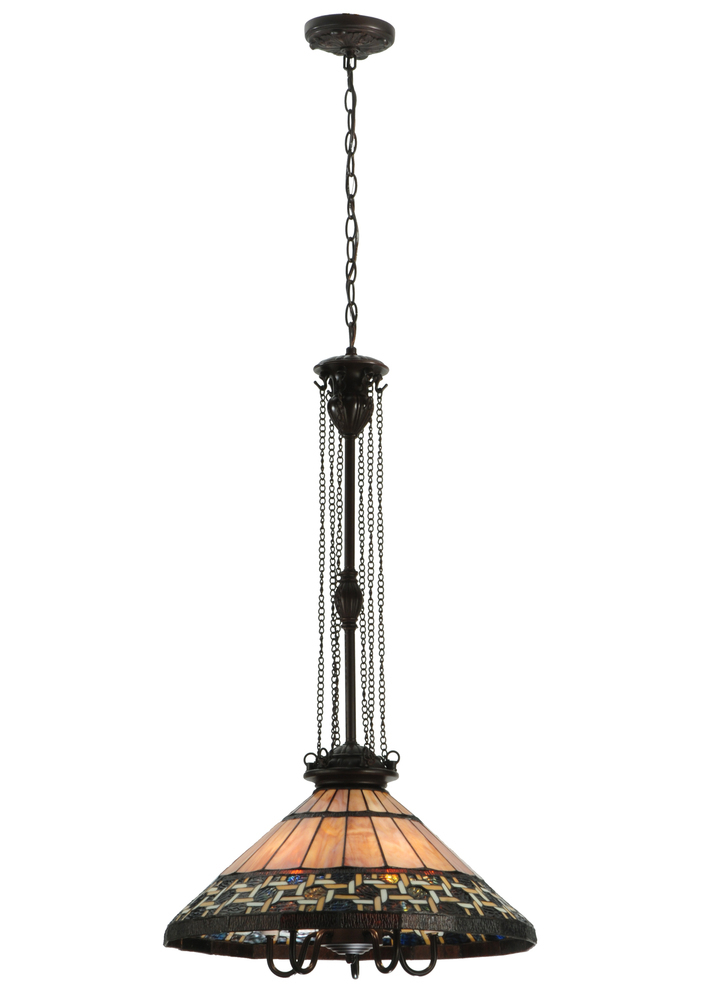 Named for the Greek word for light; Ilona will stir conversations among family and friends with a dramatic Honey and Beige colored knotwork design on Wispy Blue/Green Rippled glass. The pendant's background includes Beige; Mauve and Purple art glass while Root Beer colored glass borders enhance the beauty of this exquisite art glass shade; which is created using Meyda Tiffany's famous copperfoil construction process. The hardware is finished in a warm Mahogany Bronze.