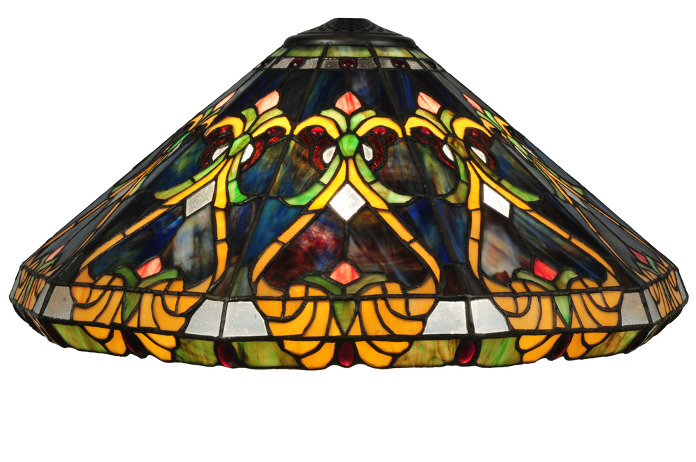 Beautiful stained glass created for a resplendent look best describes Middleton. Leafy Green Holly; Amber motifs with Ripe Red Berry glass accents and jewels highlight this decorative design on a Burgundy background. The art glass shade was created using the famous Meyda Tiffany copperfoil construction process. Pair with a base to create a stunning table or floor lamp; or match with hardware to build a mesmerizing ceiling fixture. The Middleton Shade is included in our American designed; handcrafted Stained Glass Lighting Collection. Each shade is a unique work of art with color variations based on natural ingredients inherent in the glass. Contact us if color matching is critical when ordering multiple items.