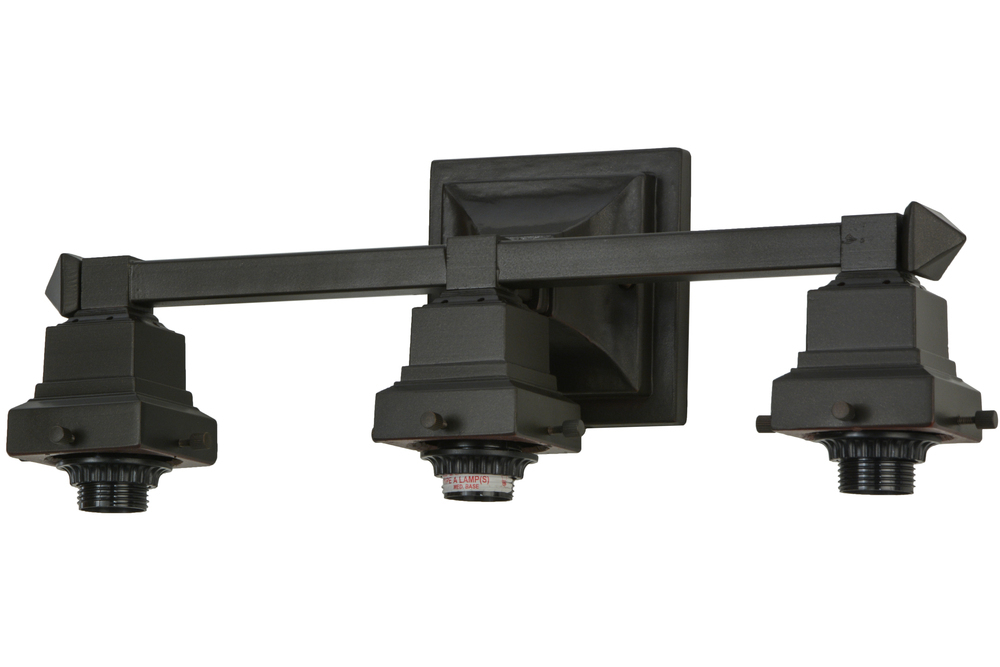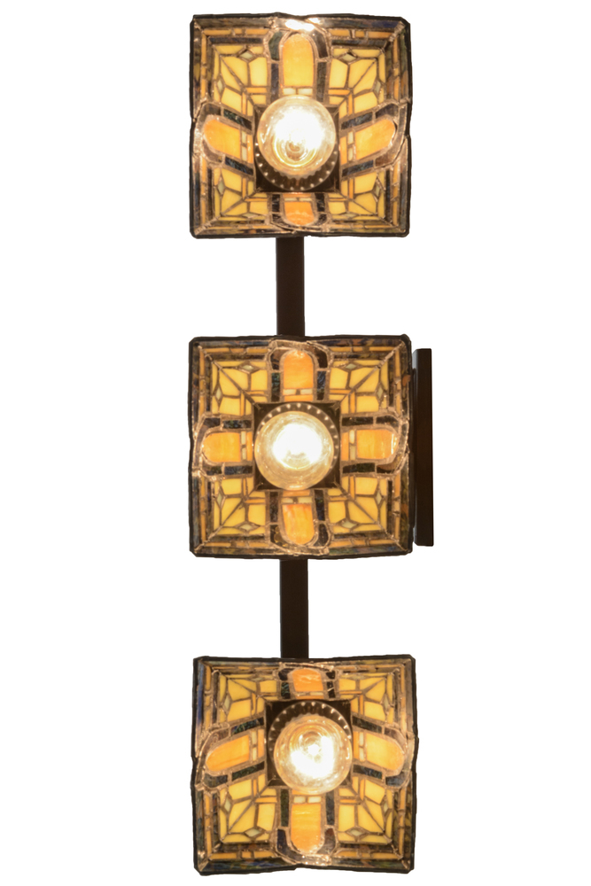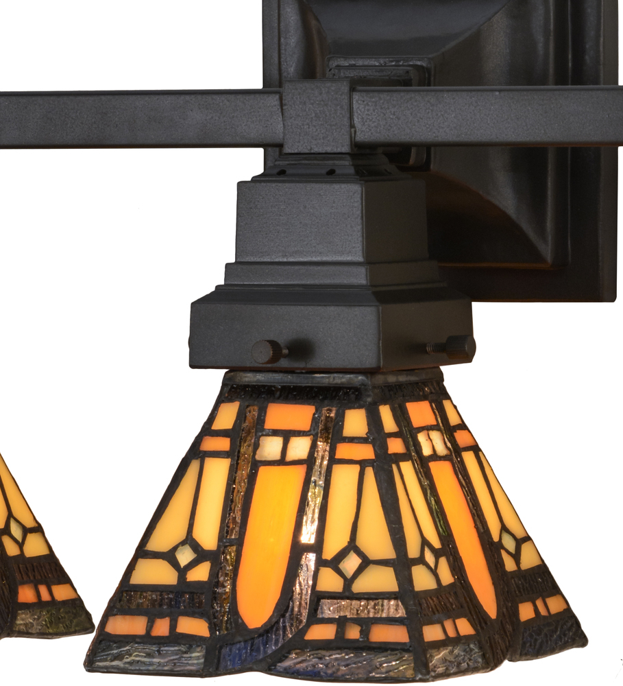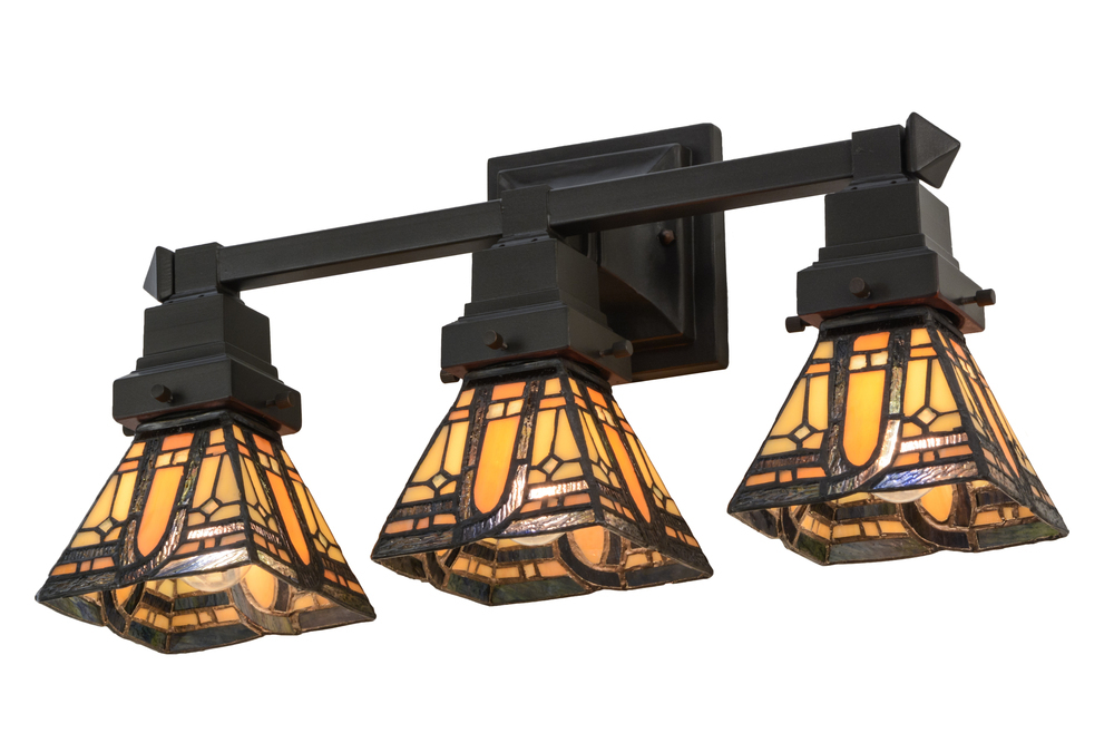 A powerful design statement fueled by strong lines and a simple geometric design; this vanity light offers 3 Sierra Prairie shades featuring Beige and Honey Tones accented with multicolored Ripple glass. Brilliant stained glass; appealing Mission styled shades and old world hardware finished in a Mahogany Bronze hue are fashioned into a handsome lighting fixture. The art glass shades are constructed using the famous Meyda Tiffany copperfoil construction process. The fixture can be used as a vanity light in a fine bath or as a wall sconce in any other room. Custom sizes; colors; designs and dimmable energy efficient lamping options are available. UL and cUL listed for damp and dry locations.