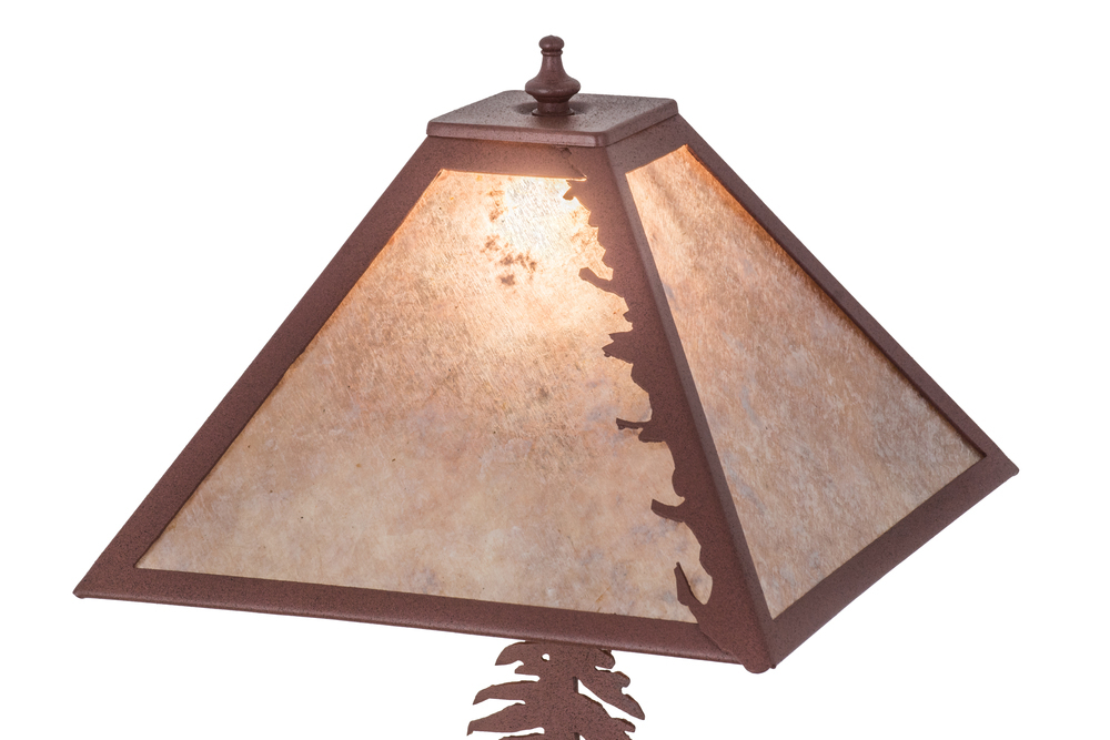 Capture the allure of natural charm as a Tall Pine Tree and Bear highlights this Rust finished lamp base; which supports a stunning Silver Mica shade. The shade features matching decorative accents that represent the edges of serrated leaves. A 3-section switch lights up the shade; base or both. This wildlife inspired table lamp is handcrafted by Meyda artisans in the Yorkville; New York manufacturing facility at the foothills of the spectacular Adirondack Mountains. Custom colors; styles; sizes and dimmable energy efficient lamping options are available. The lamp is UL and cUL listed for dry locations.