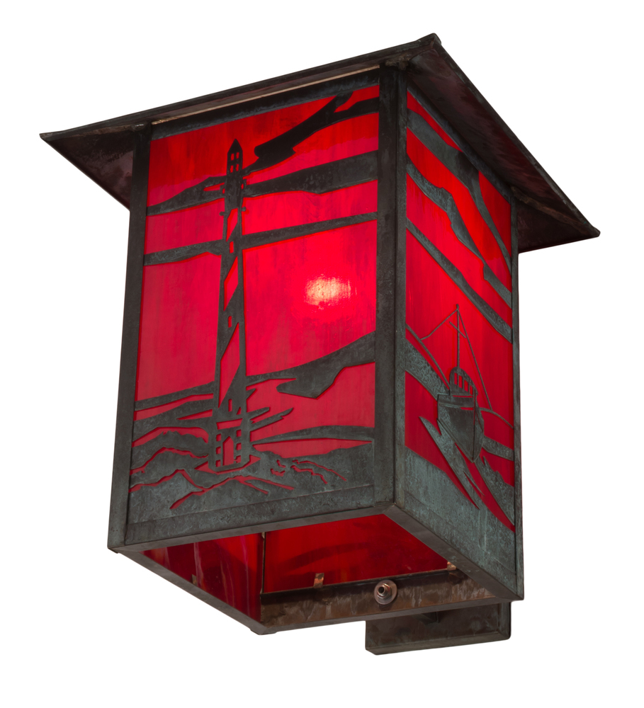 An Moose wanders by a lake in the woods on this nature inspired etched brass lamp shade. The lamp is finished in Mahogany Bronze with Stormy Orange and Blue Green stained art glass panels; and is handcrafted in the USA by Meyda artisans.