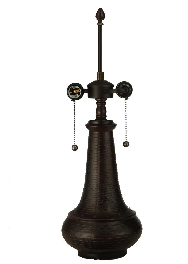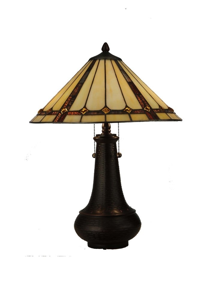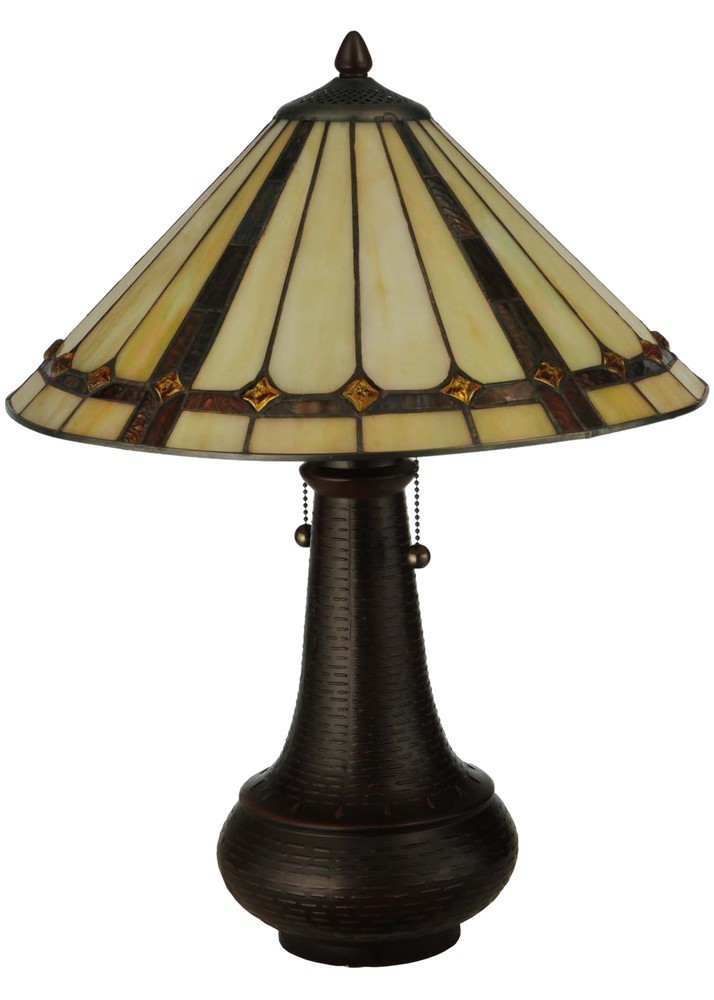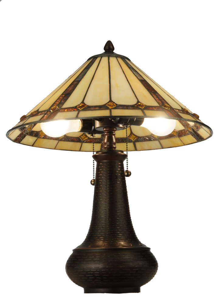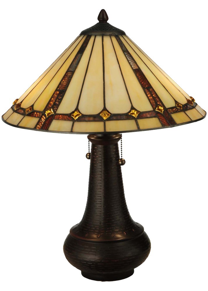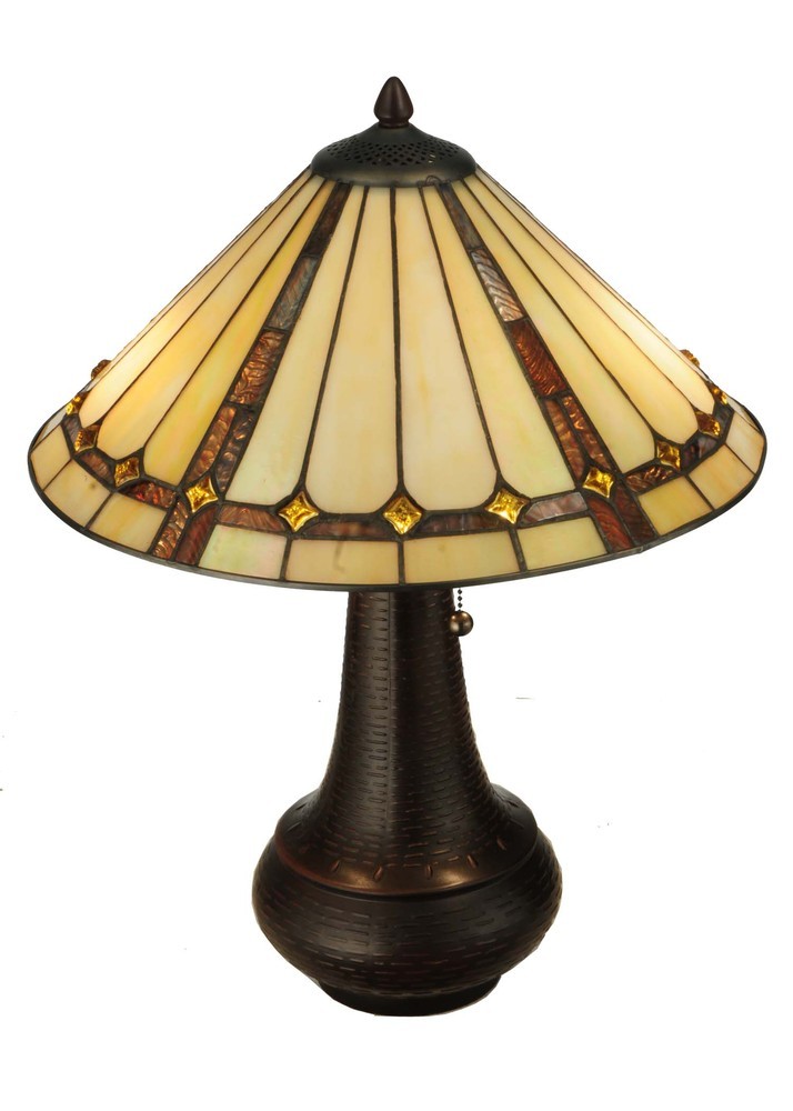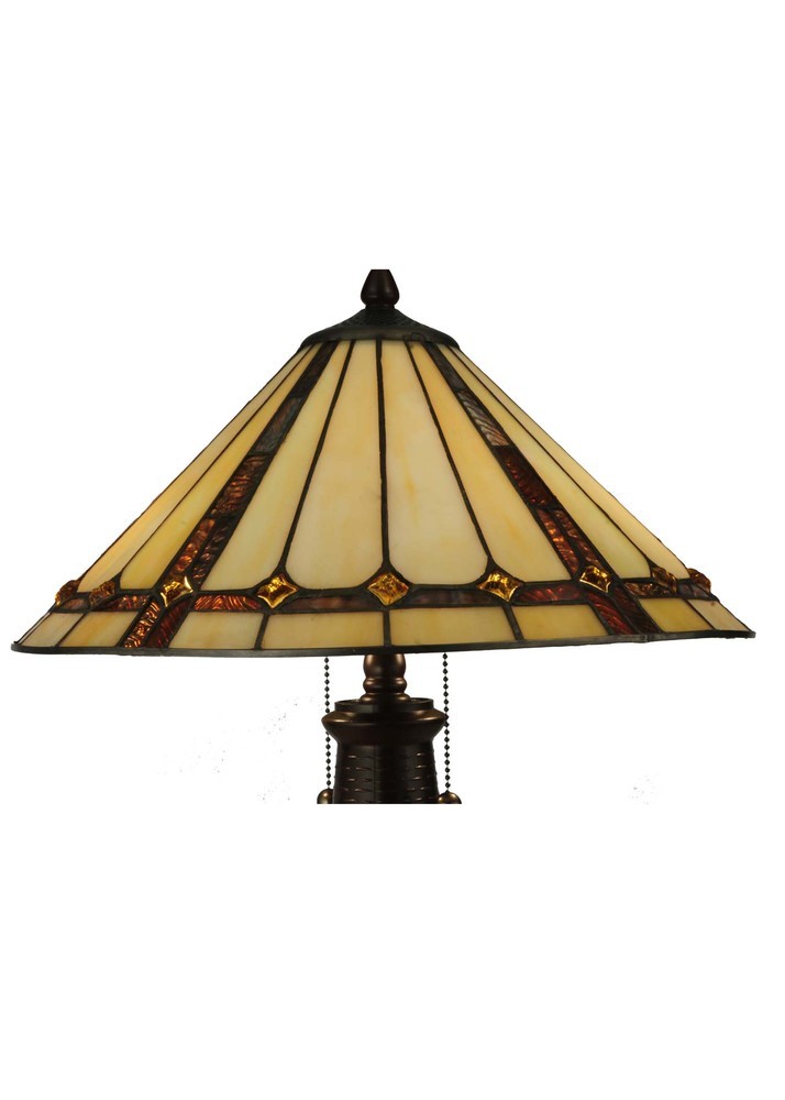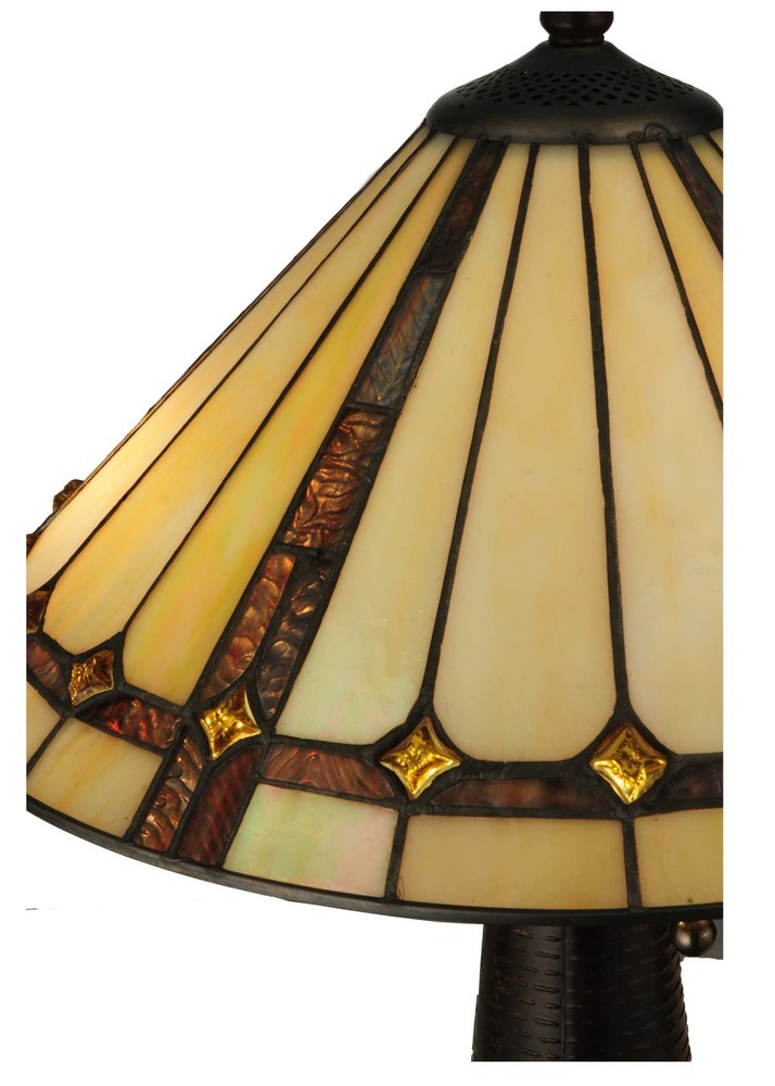 Exquisite Purple and Sunburst colored trim with Amber jewels adorn Beige Iridescent glass on this conical lamp shade. This stunning shade is constructed with Meyda Tiffany's famous copperfoil construction process. The elegant lustrous lamp base is finished in a warm Mahogany Bronze.