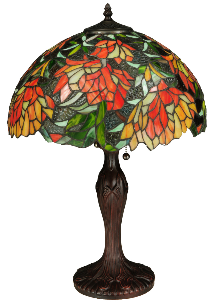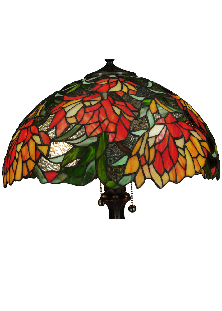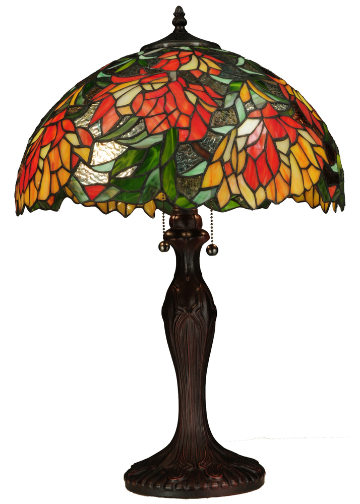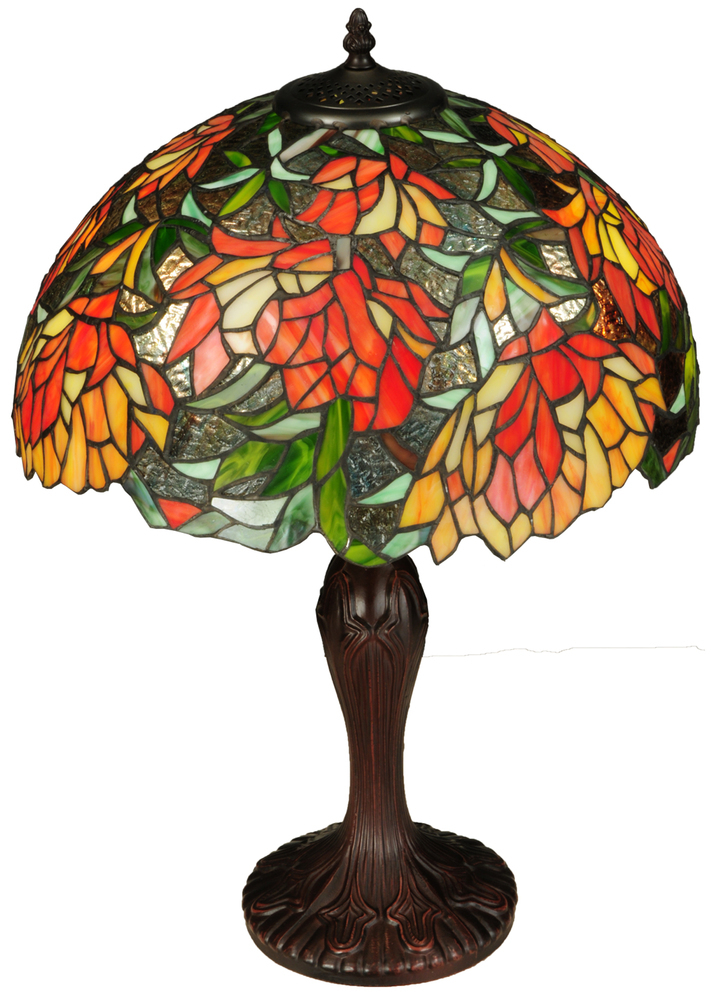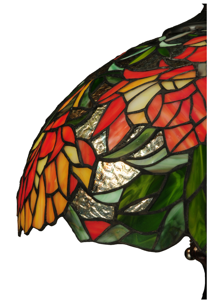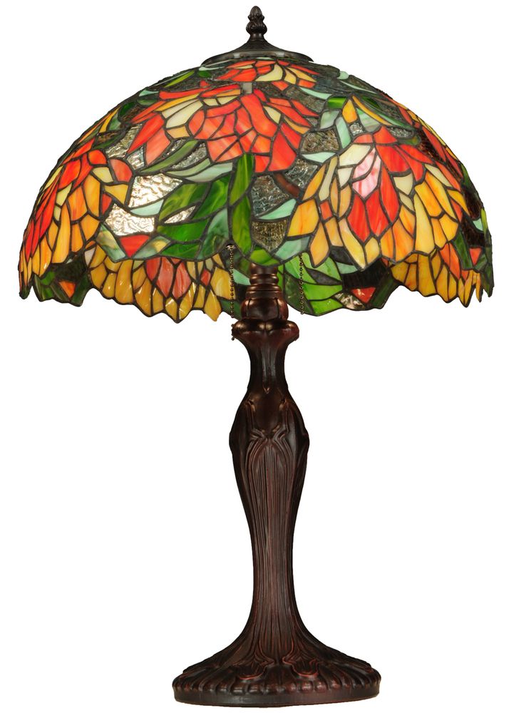 In all its natural beauty; a bouquet of blossoming flowers in Peach; Tangerine and Yellow hues bloom while surrounded by radiant Willow Green leaves and glistening Multicolored Rippled glass. This lamp is so beautiful that you will think you are sitting in an English Garden. This stunning Tiffany styled stained glass shade; with a coordinating base in a warm Mahogany Bronze finish; will add a brilliant; luxurious elegance to your home.