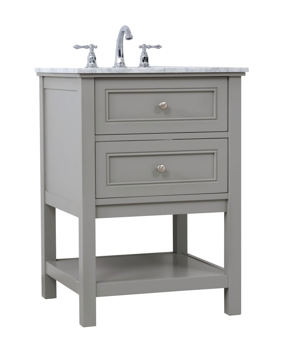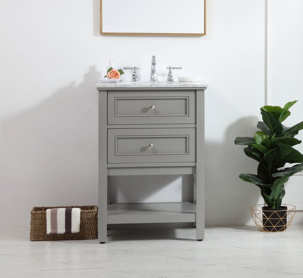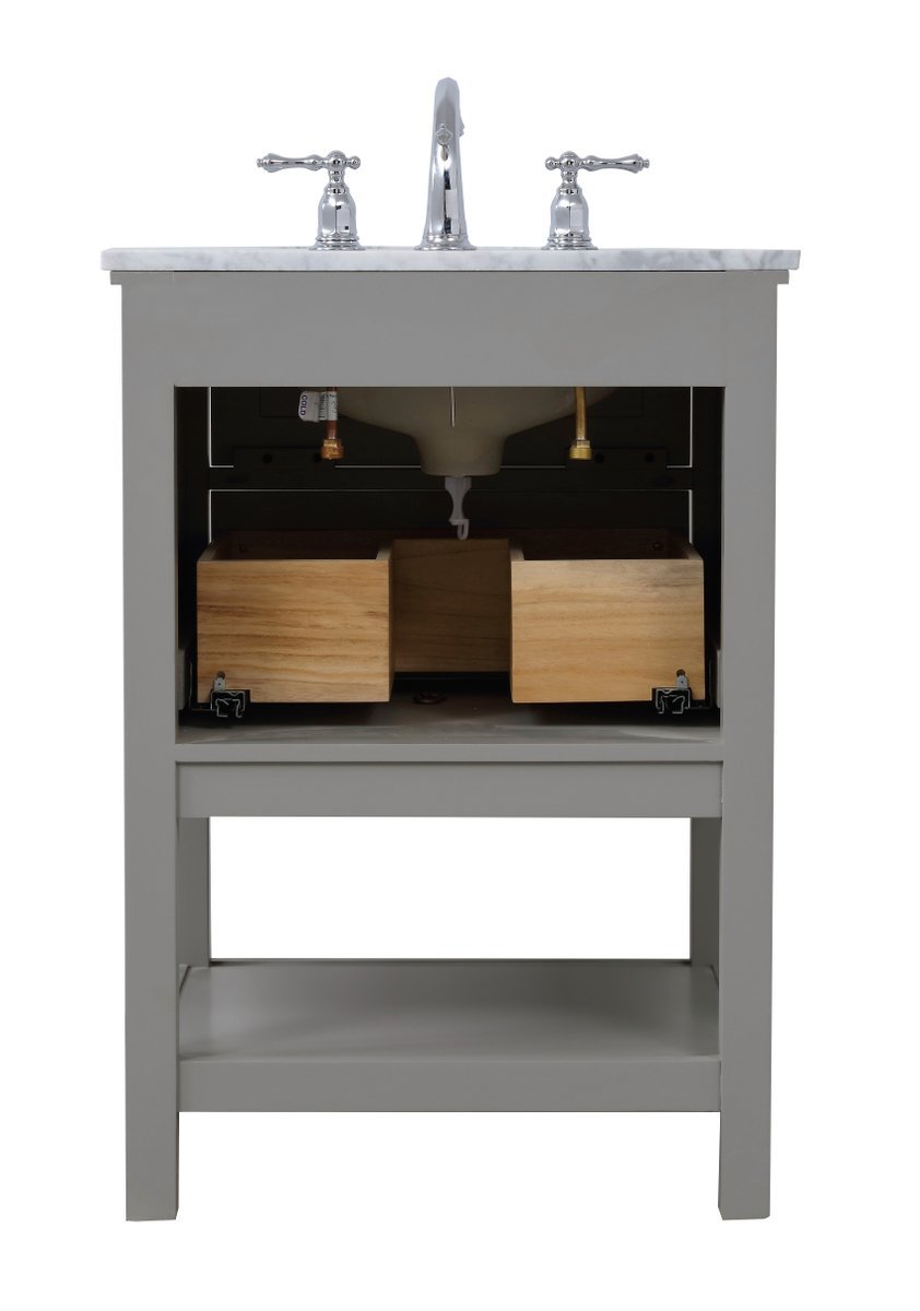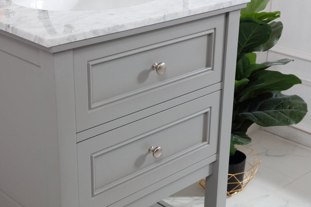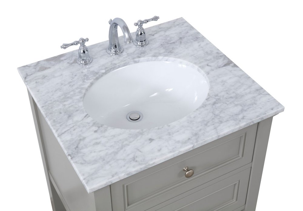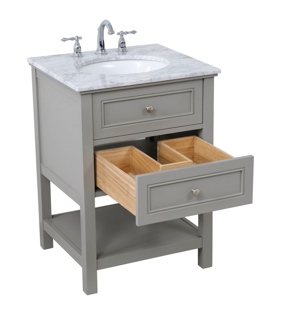 Create a refined and relaxing bath space with this contemporary design vanity, presenting its simplicity and clean straight lines in a minimalist appeal. The 24" soft-grey vanity, crafted of solid poplar wood, provides ample storage within its soft-close drawer and open shelf base, accentuated with chrome hardware. Rounding out the design is a luxurious Itallian Carrara white marble with a white porcelain under-mount oval sink.