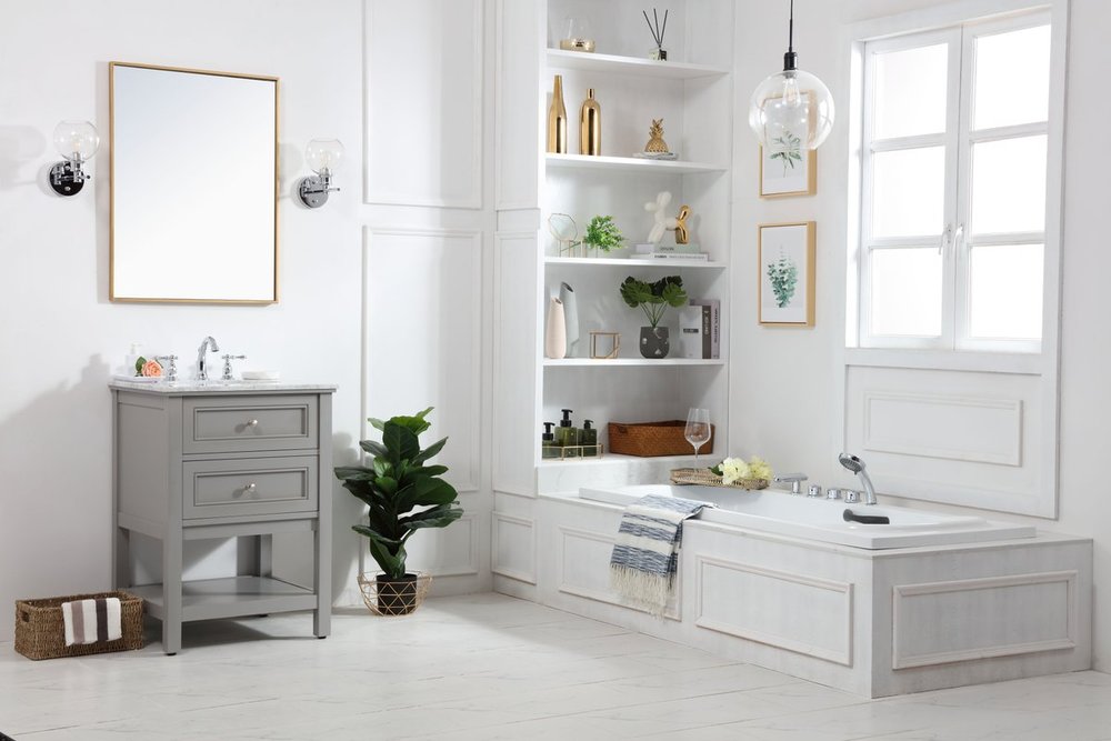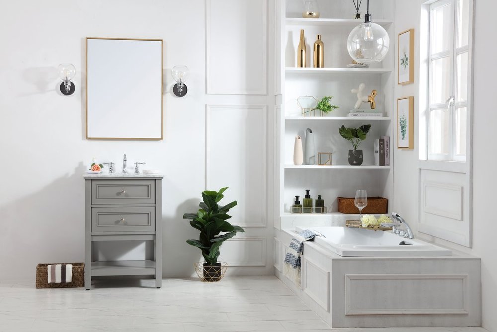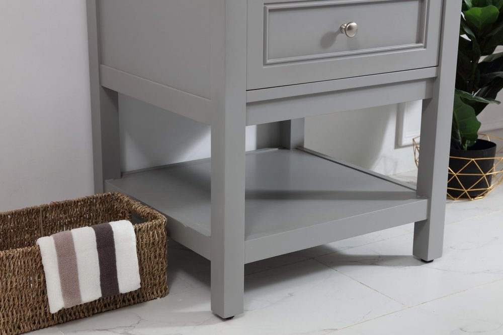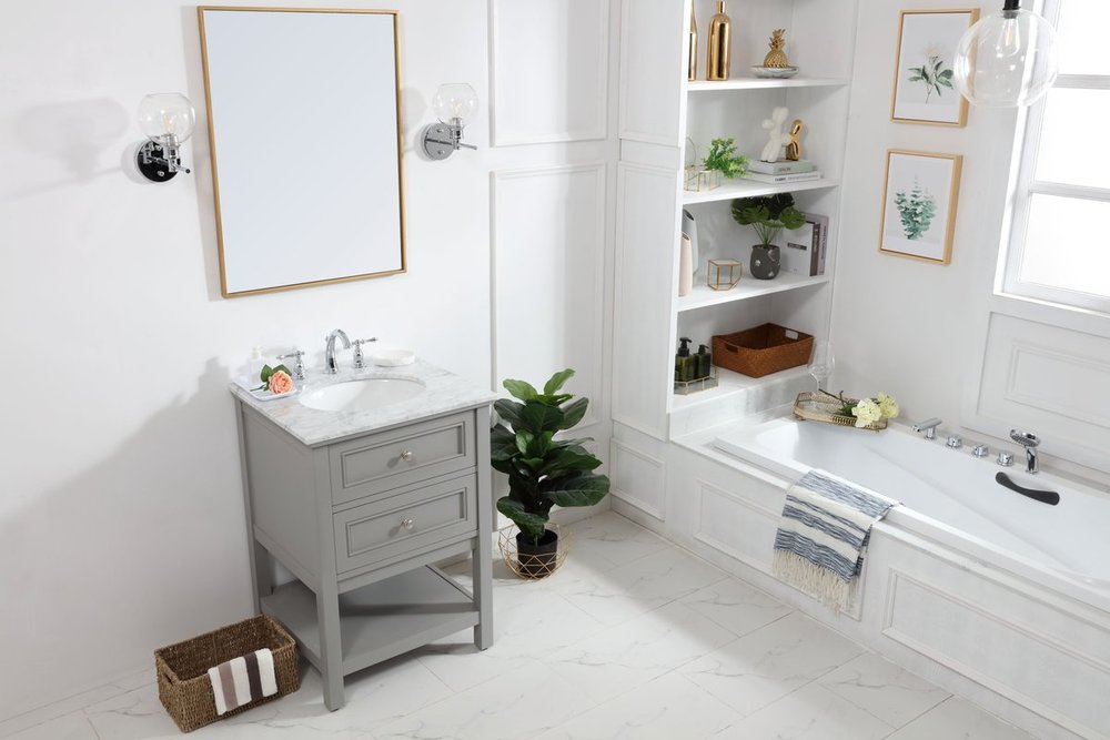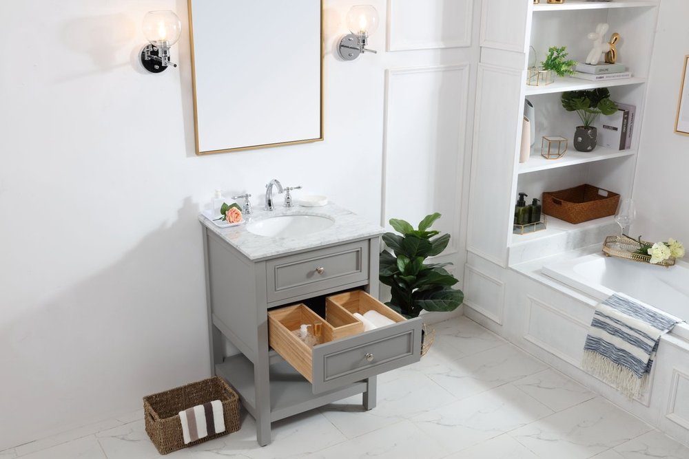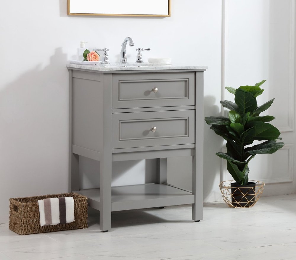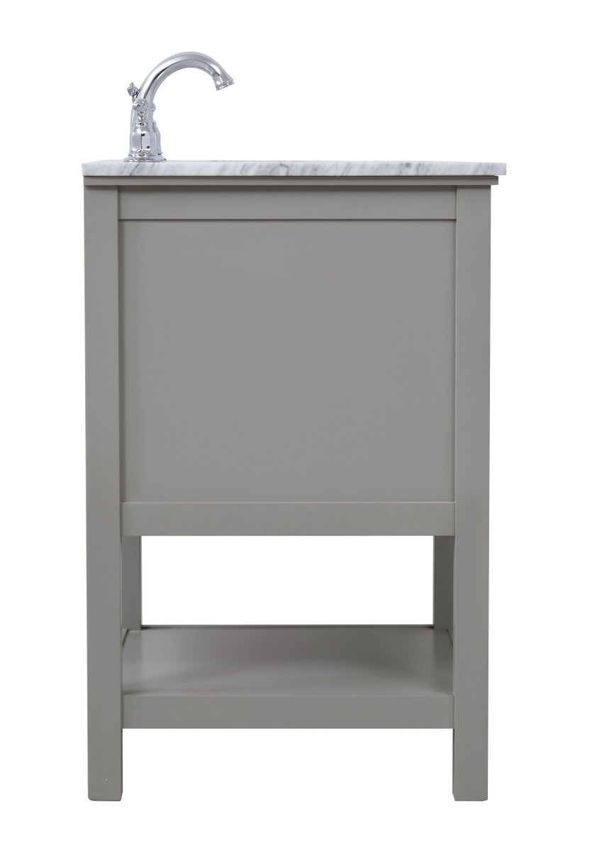 Create a refined and relaxing bath space with this contemporary design vanity, presenting its simplicity and clean straight lines in a minimalist appeal. The 24" soft-grey vanity, crafted of solid poplar wood, provides ample storage within its soft-close drawer and open shelf base, accentuated with chrome hardware. Rounding out the design is a luxurious Itallian Carrara white marble with a white porcelain under-mount oval sink.