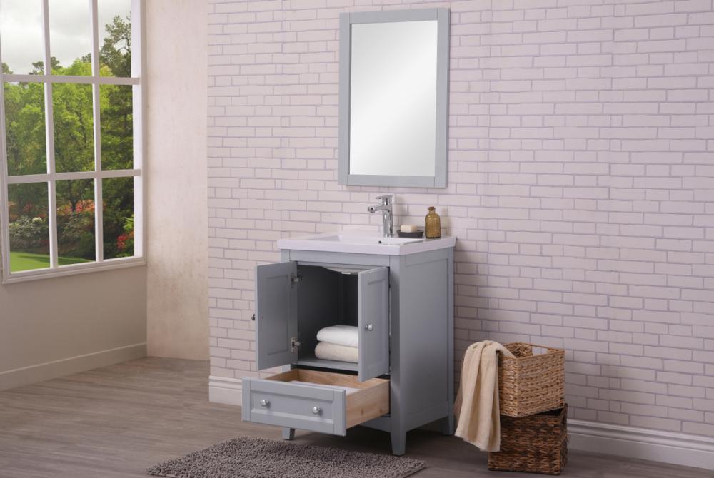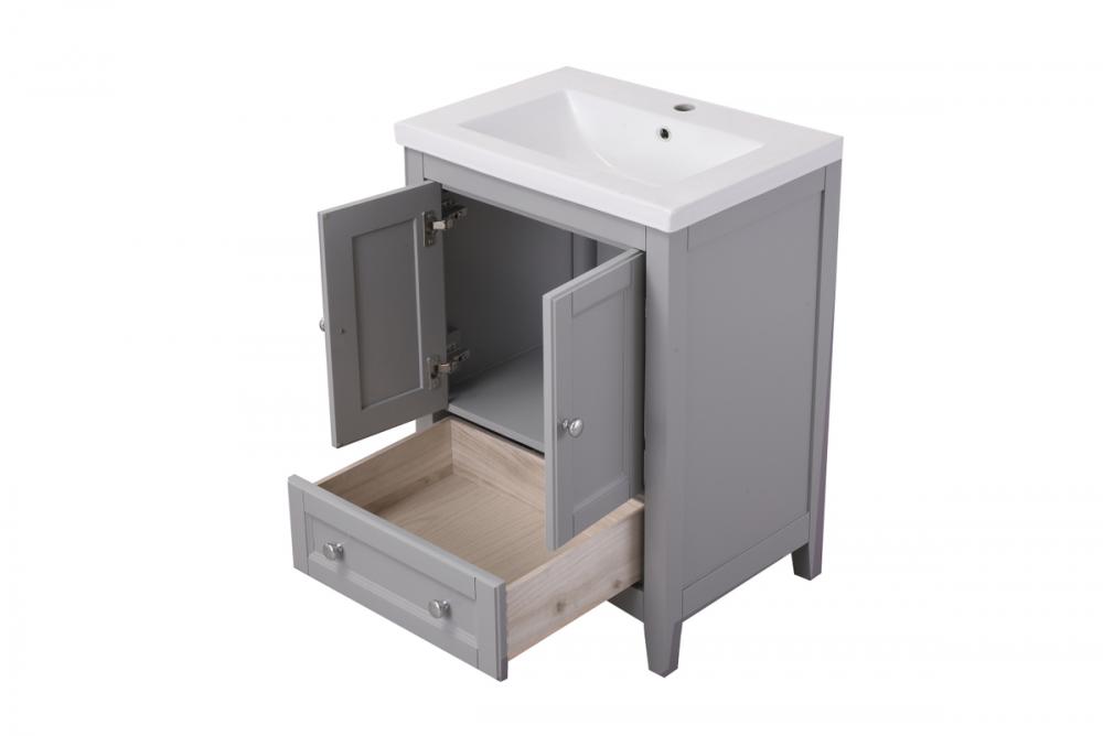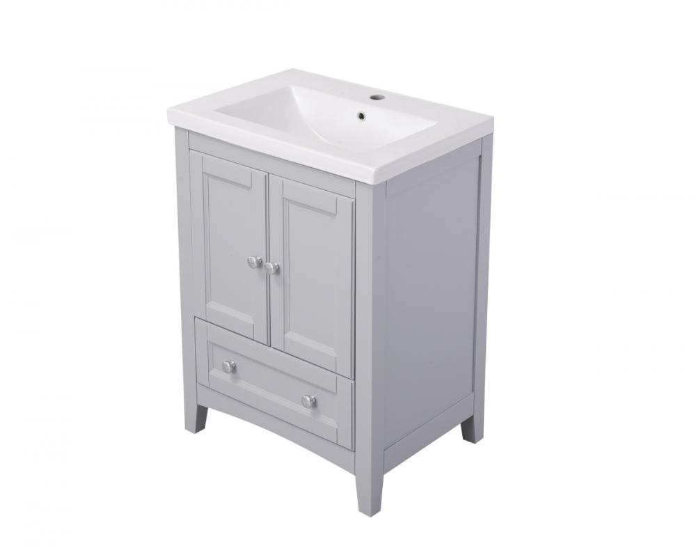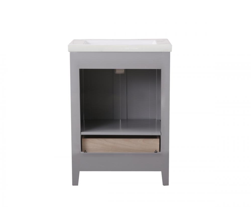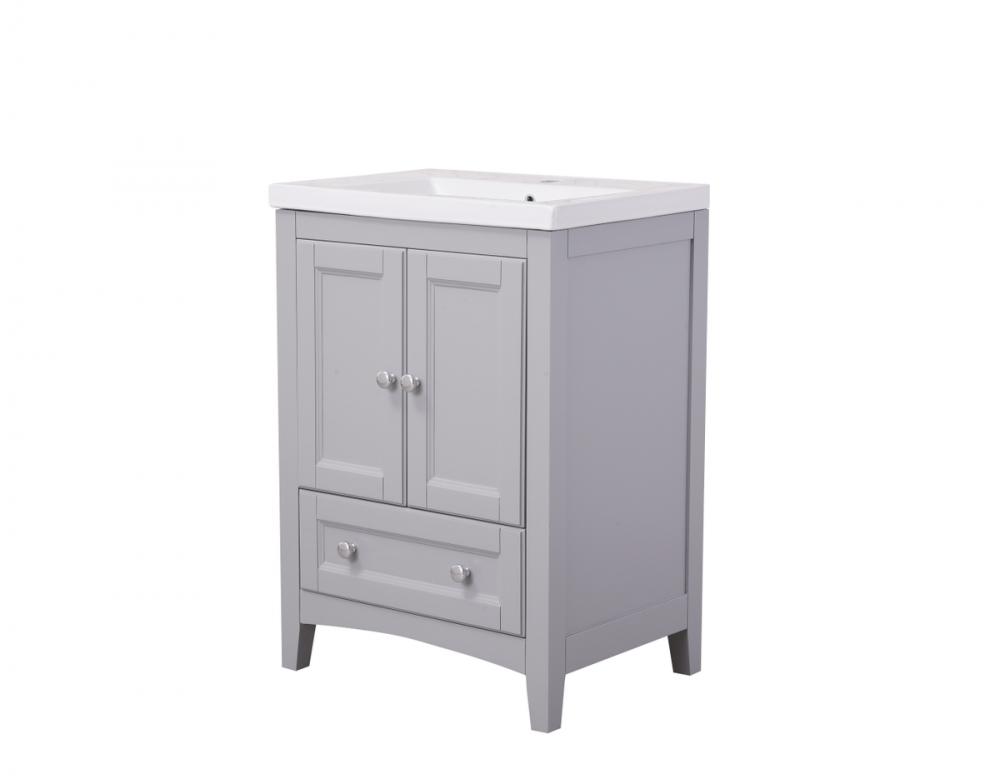 The contemporary design of our “Saturn” vanity will embellish your home or office bathroom perfectly! From its attractive rectangular white resin countertop and resin sink—which ensure non-stain, scratch-resistant and maintenance-free use--to its handpainted gray cabinet and solid wood frame and drawer, you’ll immediately sense the quality exuded by this fashionable vanity. It also features stylish chrome knobs, slightly tapered legs and 2-door, 1-drawer clean-lines styling. · Measurements: W24” x D18” x H34” · white resin rectangular countertop · Single faucet hole, ready to install · white resin rectangular sink · 2 doors, 1 solid wood drawer with soft-closing undermount slides · Constructed of kiln-dried solid wood and MDF · Faucets shown are not included. Cabinet comes completely assembled—resin countertop easily attached to cabinet. Expertly engineered packing.