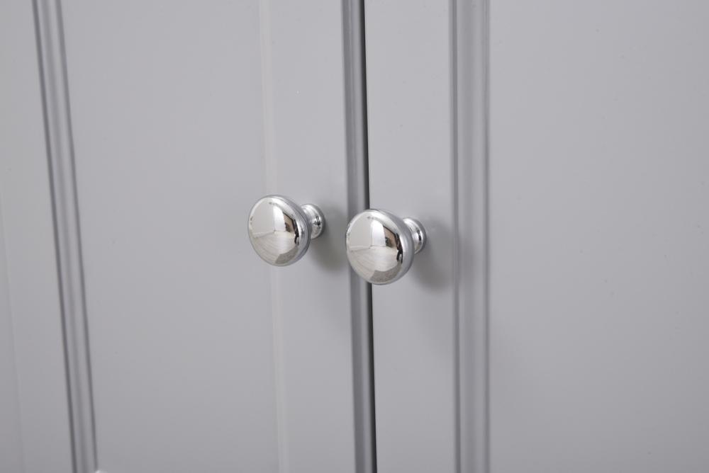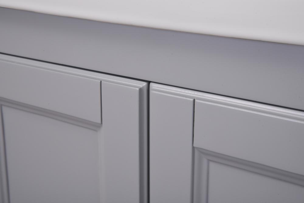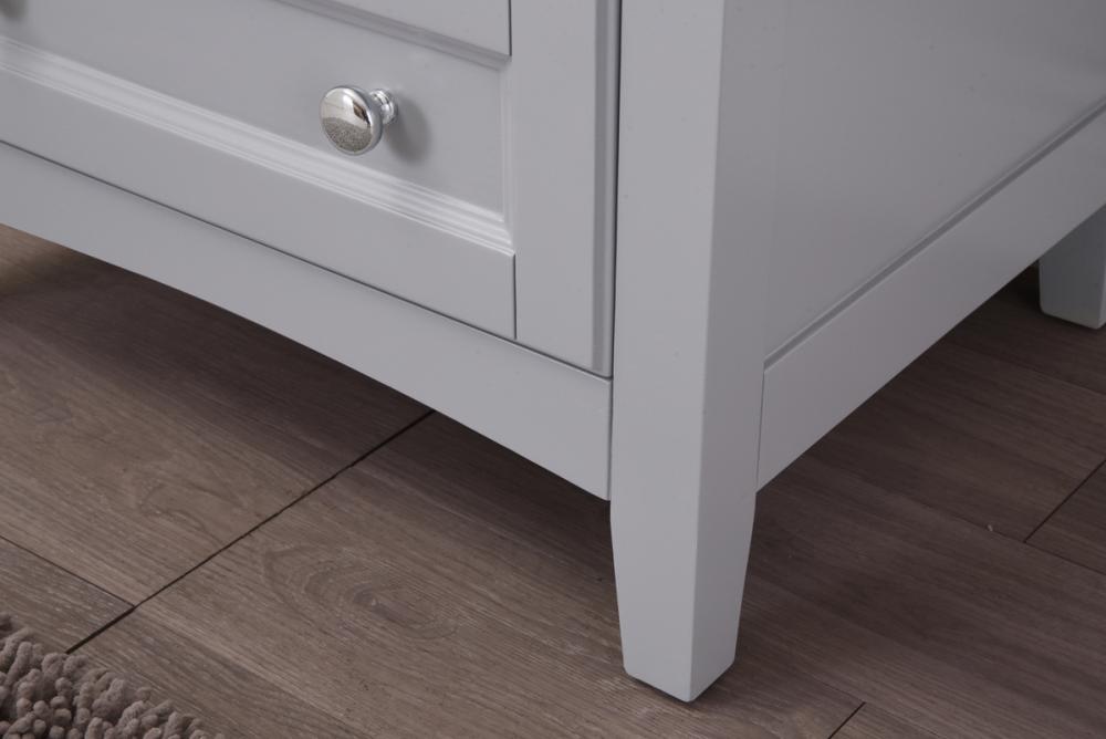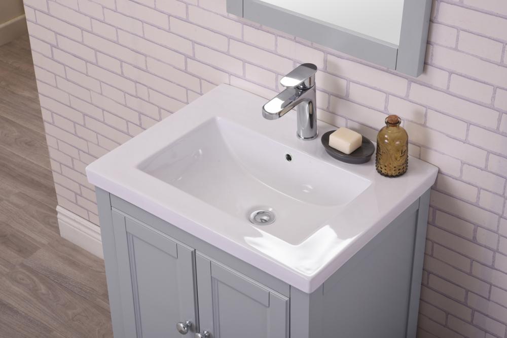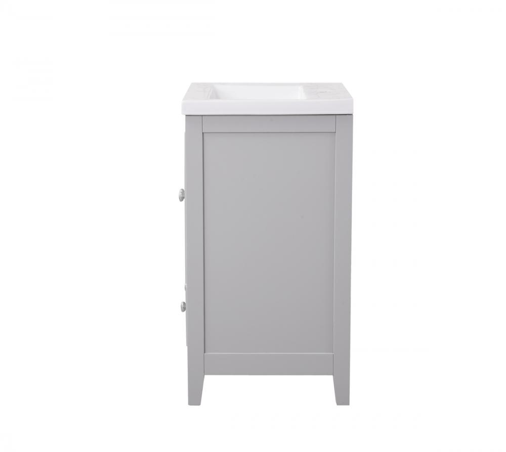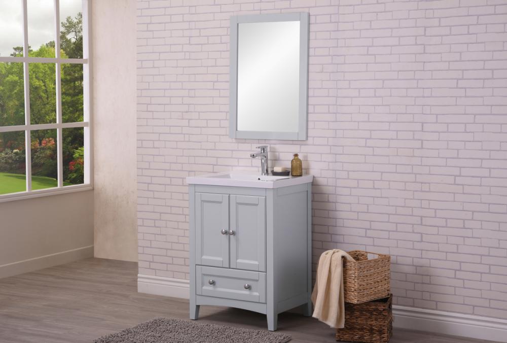 The contemporary design of our “Saturn” vanity will embellish your home or office bathroom perfectly! From its attractive rectangular white resin countertop and resin sink—which ensure non-stain, scratch-resistant and maintenance-free use--to its handpainted gray cabinet and solid wood frame and drawer, you’ll immediately sense the quality exuded by this fashionable vanity. It also features stylish chrome knobs, slightly tapered legs and 2-door, 1-drawer clean-lines styling. · Measurements: W24” x D18” x H34” · white resin rectangular countertop · Single faucet hole, ready to install · white resin rectangular sink · 2 doors, 1 solid wood drawer with soft-closing undermount slides · Constructed of kiln-dried solid wood and MDF · Faucets shown are not included. Cabinet comes completely assembled—resin countertop easily attached to cabinet. Expertly engineered packing.