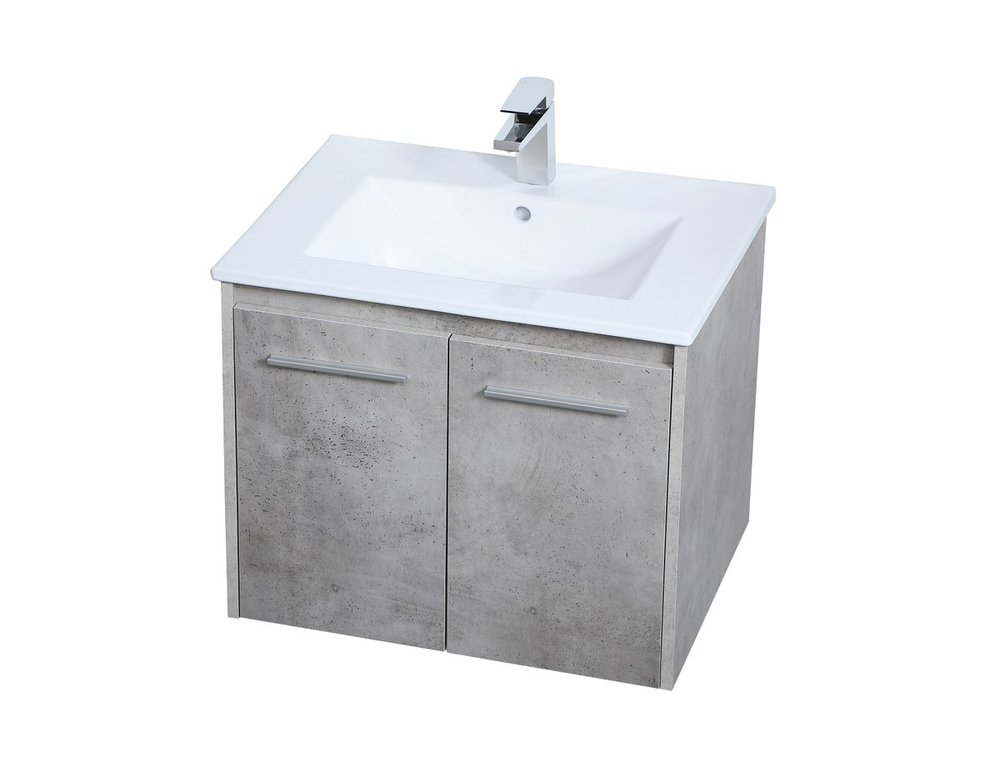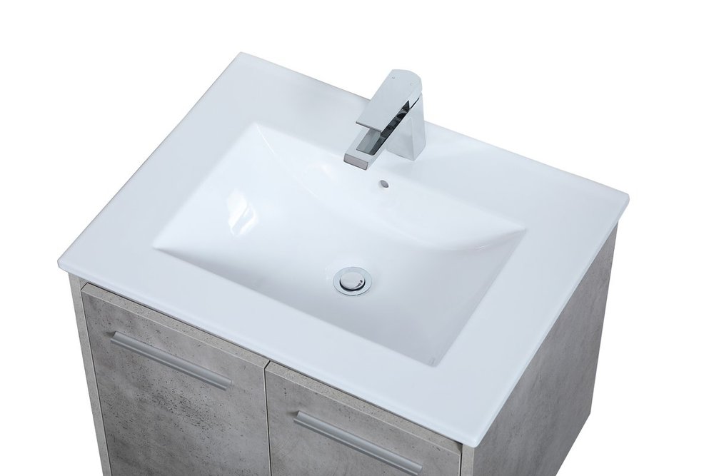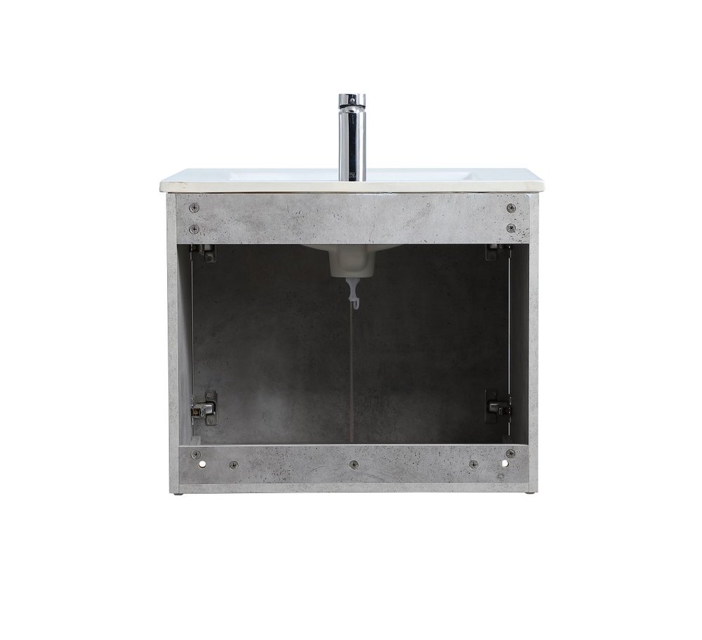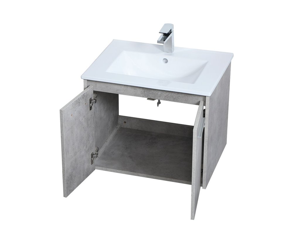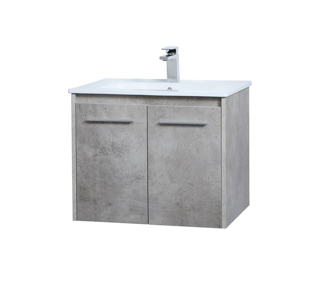 The contemporary simplicity of this 24" floating vanity in a concrete grey finish will help open the space and add stunning modern flair to your bathroom or powder room. The open space below makes it easy to show off your tiles and to clean the floor with ease--it's also the perfect place for a hamper. Double doors open to reveal plentiful of storage pace to store all of your bathroom miscellany. The clean lines that permeate through the design will surely create a fresh look in your home.