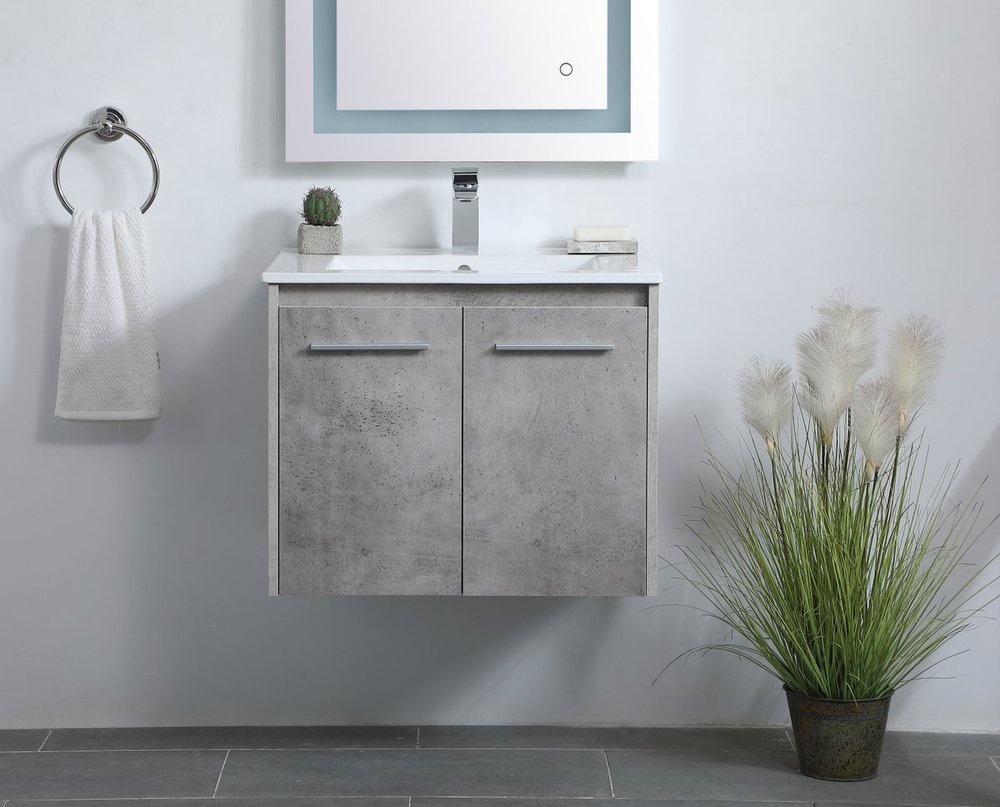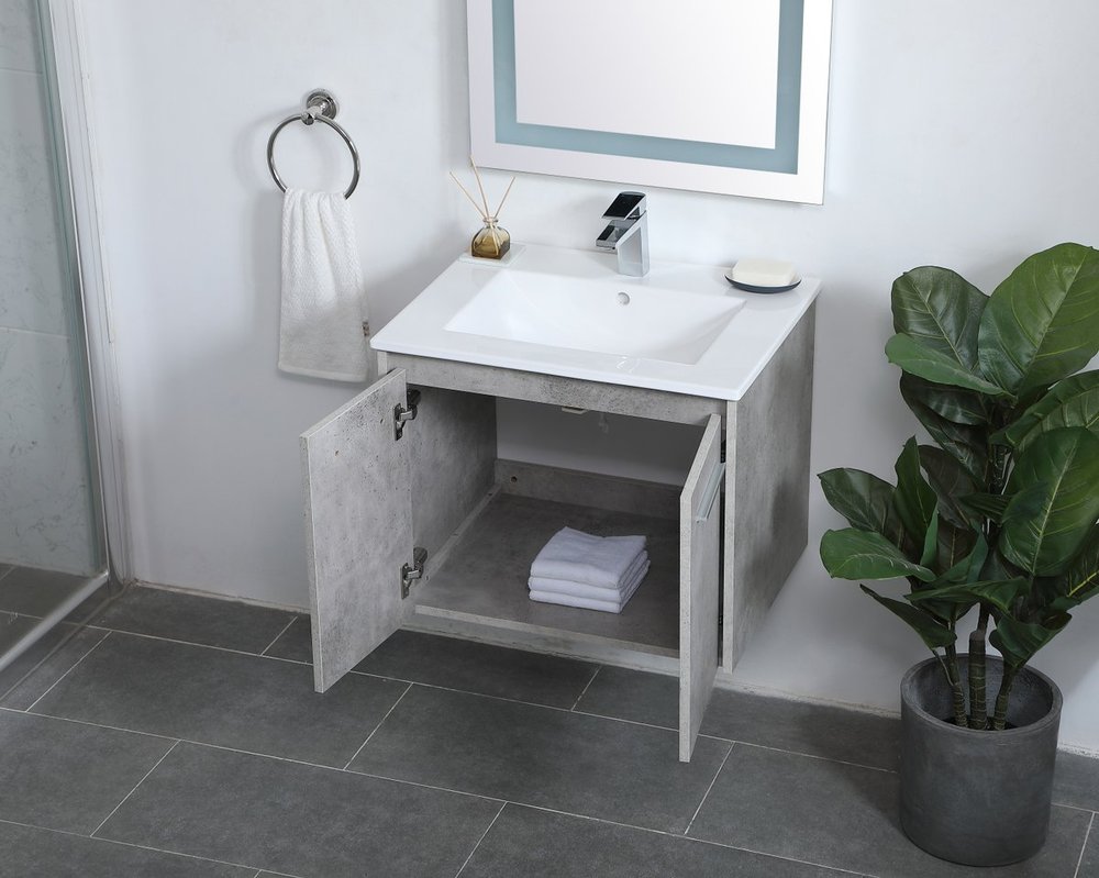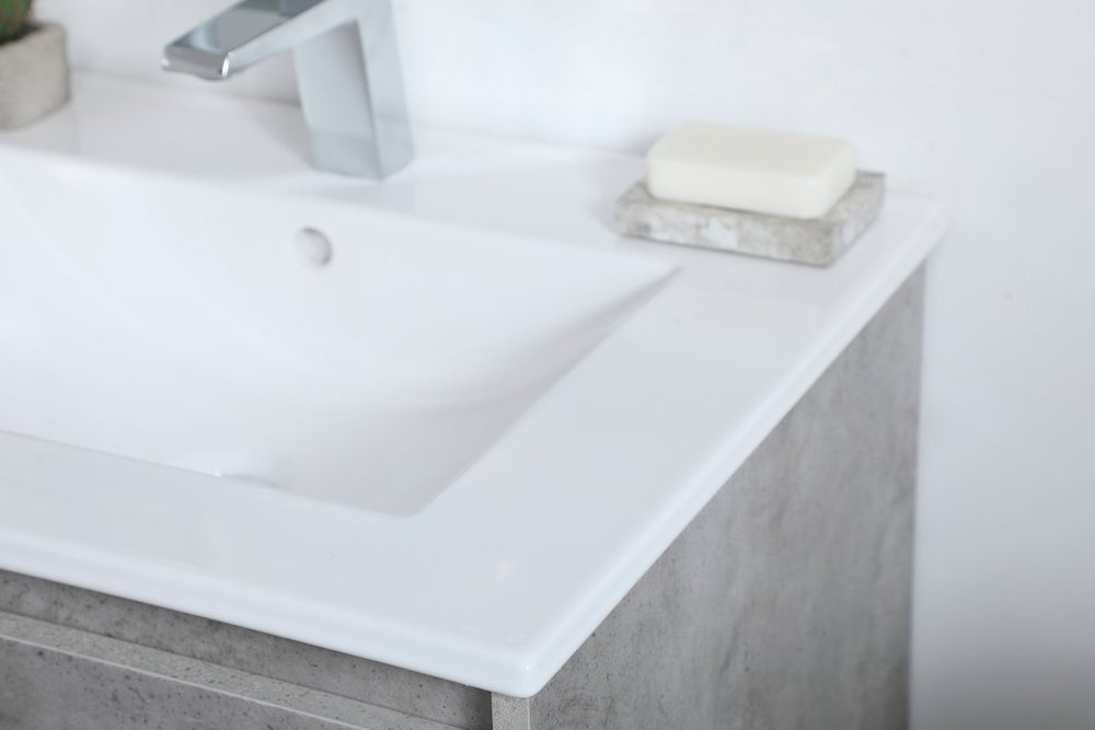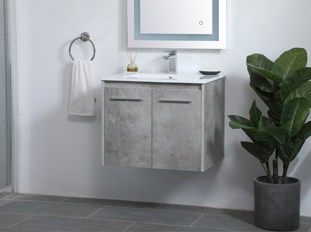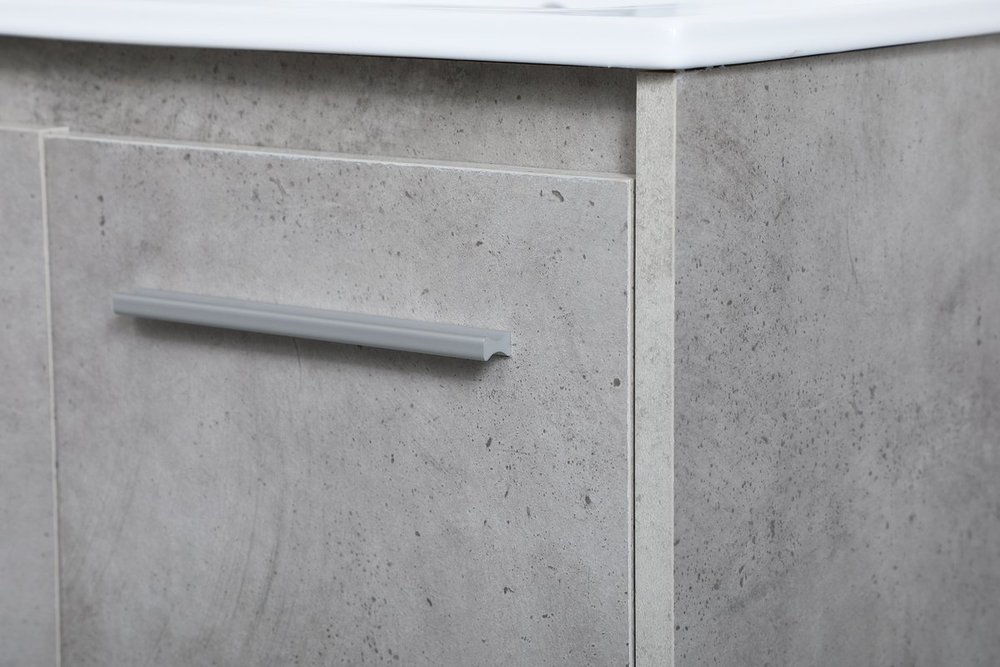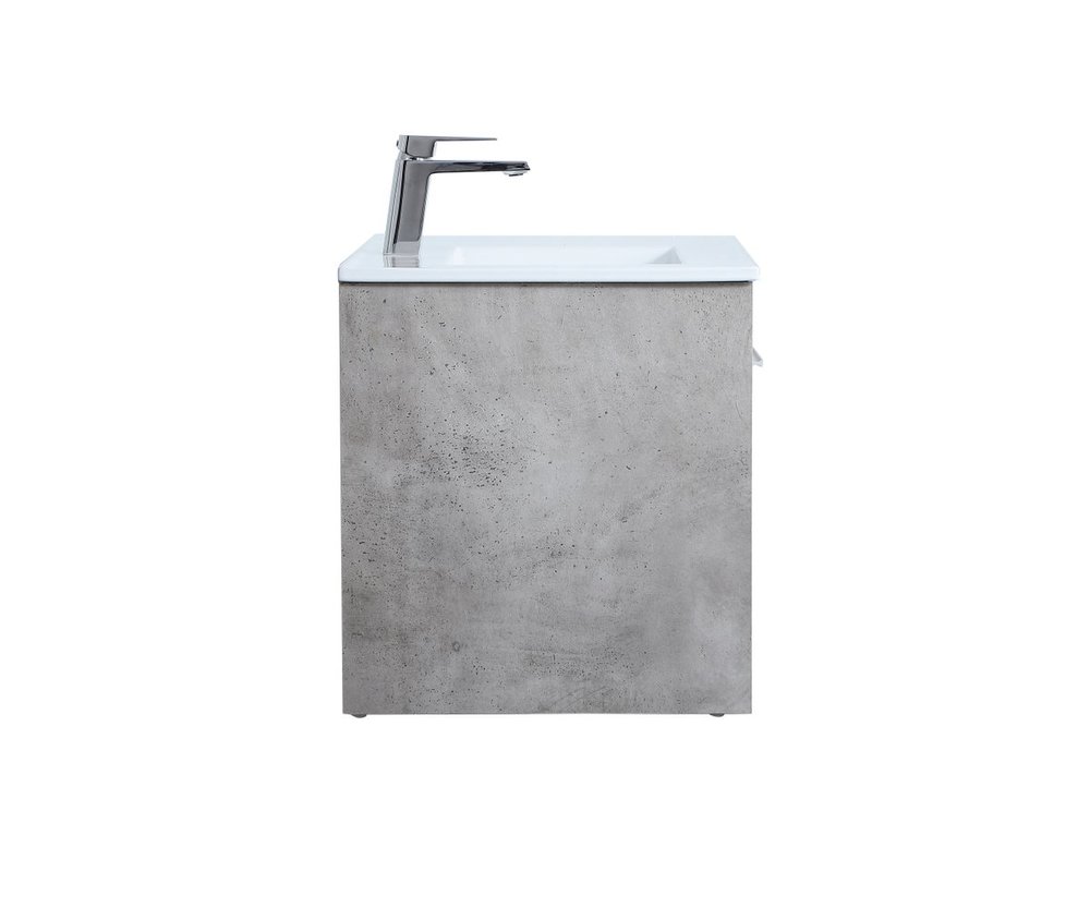 The contemporary simplicity of this 24" floating vanity in a concrete grey finish will help open the space and add stunning modern flair to your bathroom or powder room. The open space below makes it easy to show off your tiles and to clean the floor with ease--it's also the perfect place for a hamper. Double doors open to reveal plentiful of storage pace to store all of your bathroom miscellany. The clean lines that permeate through the design will surely create a fresh look in your home.