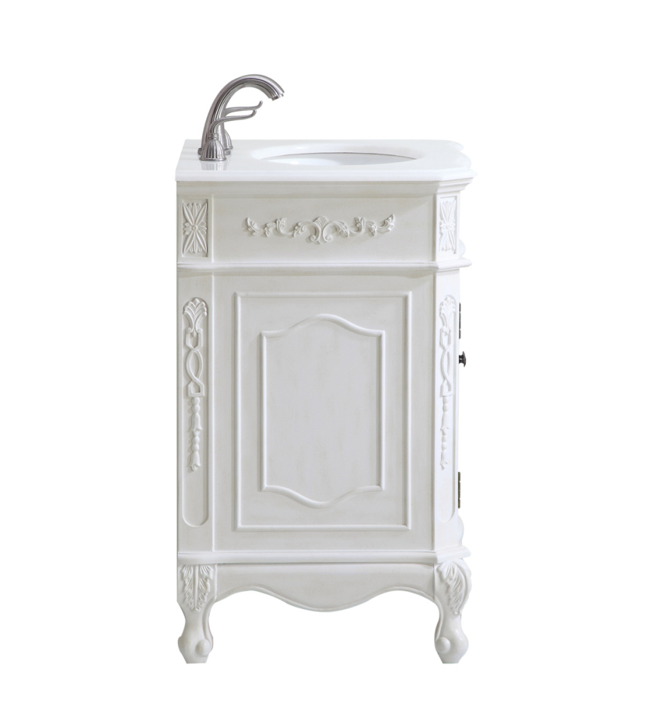 This superb balance of timeless tradition and opulent beauty in a engineered marble-topped vanity will certainly enhance the aesthetics of any home or office bathroom! Featuring an ivory white durable engineered marble countertop complimenting the hand painted cabinet with a delicate carved floral design, stands on stylishly carved solid wood French scroll feet. Don't let the design fool you, the engineered marble countertop and porcelain undermount sink allows for space to get ready, while the antique bronze hardware allows you to discover storage spaces with ease. You and your guests will marvel at this vanity that will both store away your bathroom essentials and enhance the aesthetics of your room.