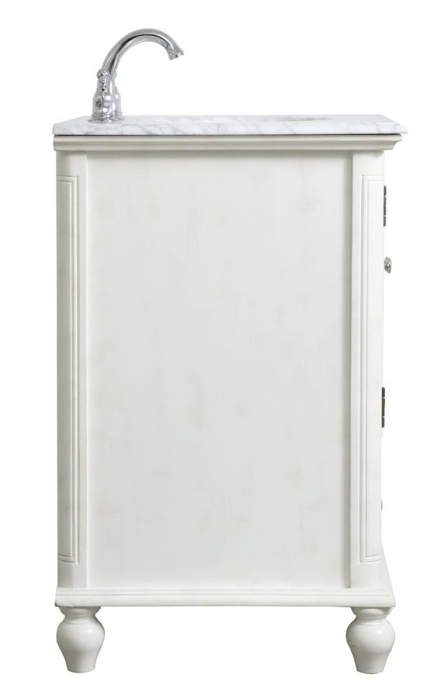 Distressed antique white finish with a luxurious carrara white marble countertop