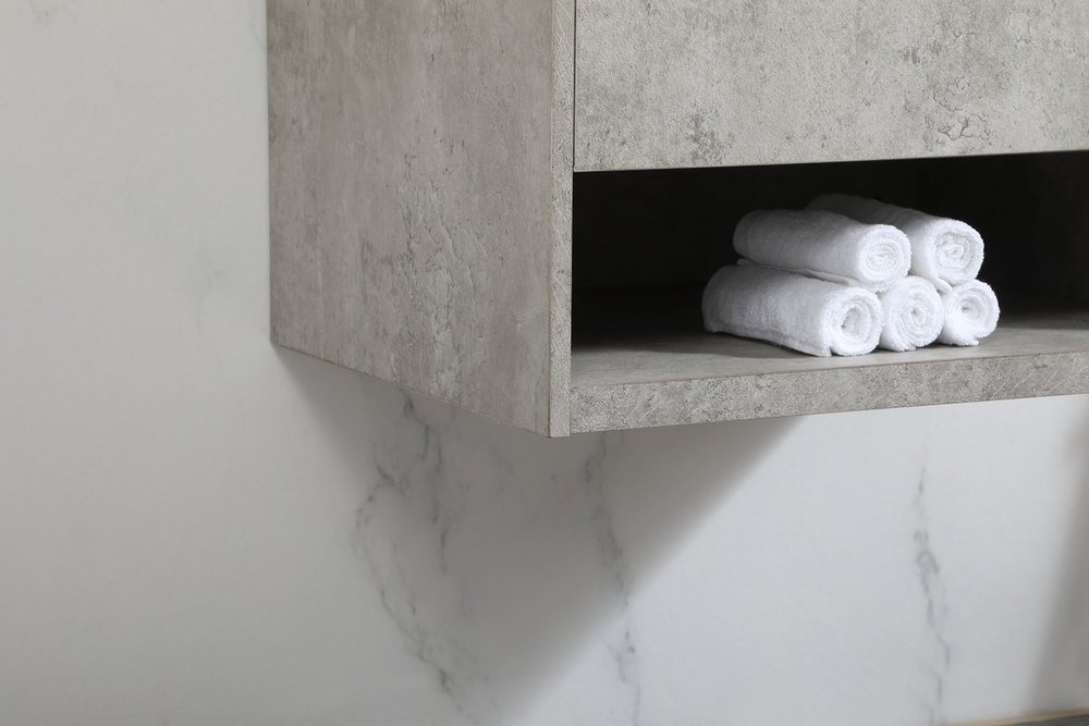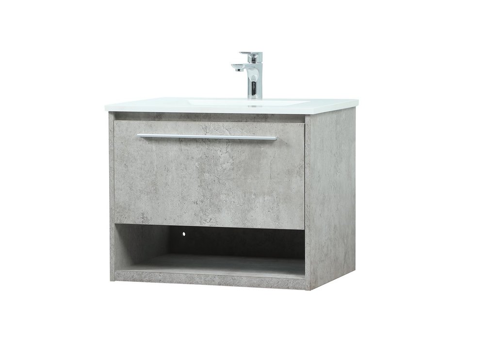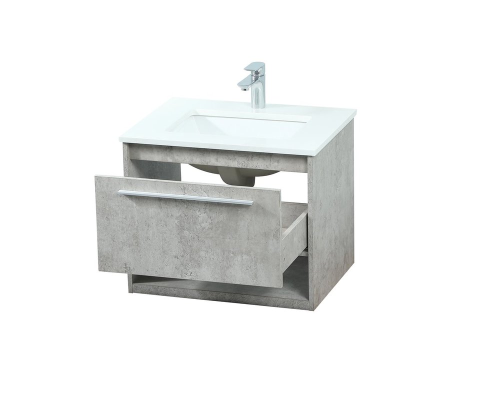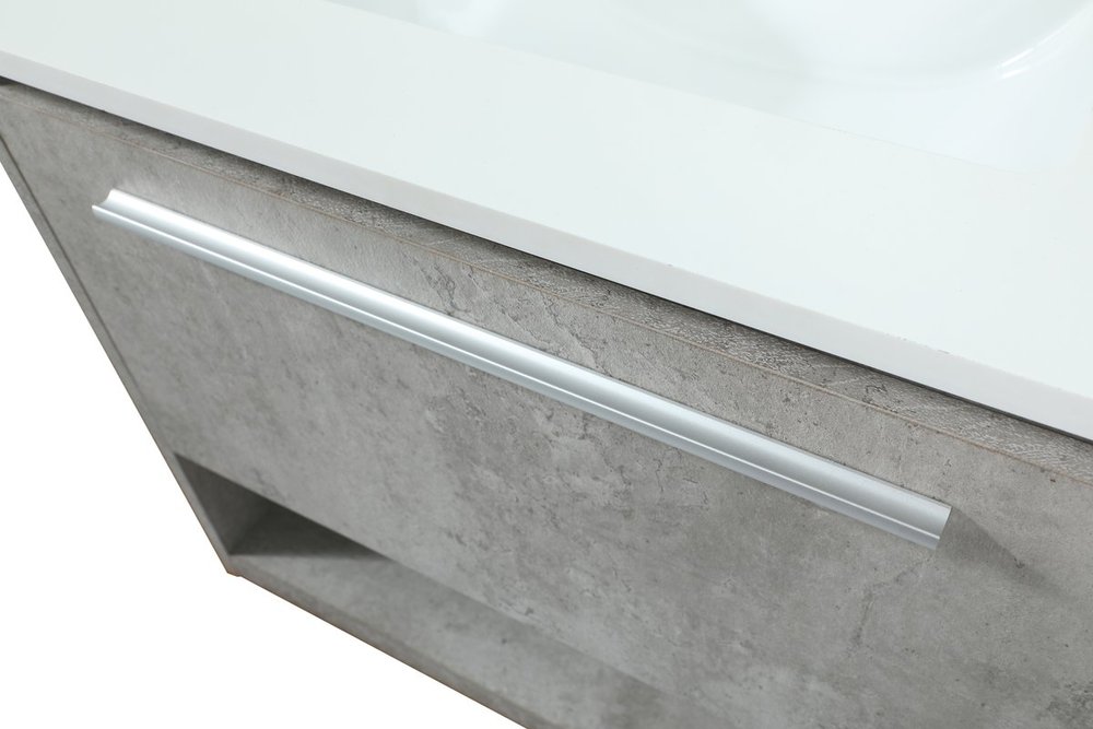 Save space and make your bathroom appear bigger with this floating vanity. Its minimal design will have you in awe, while its clean lines will leave your room feeling fresh and uncluttered. The Single u-drawer pulls out for storage while the open space below allows you to place extra towels or various other essentials. The ivory white engineered marble counter top with porcelain sink adds refined luxe while the aluminum barpull style handle adorn the vanity face.