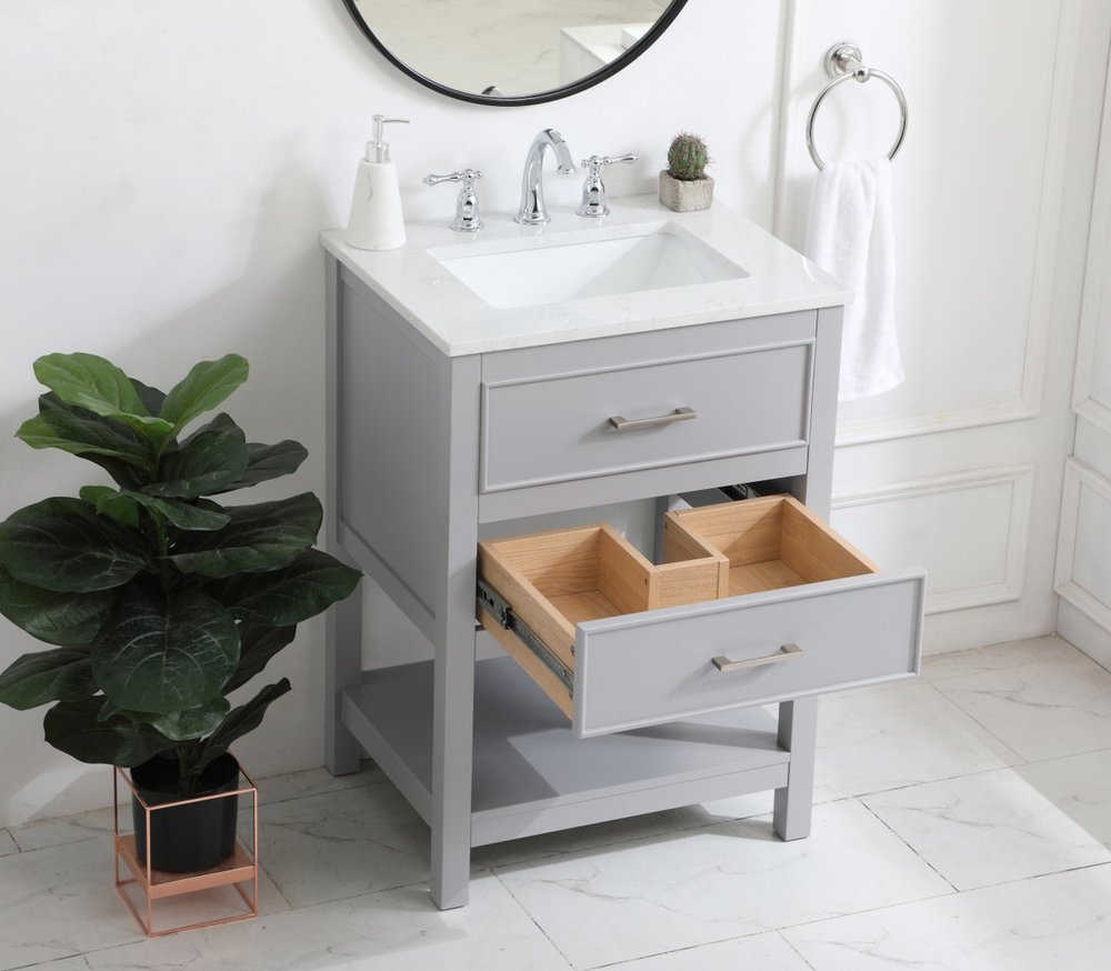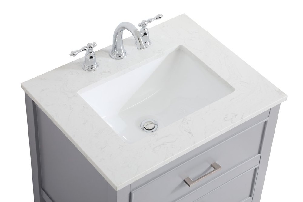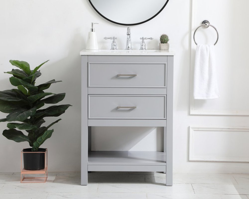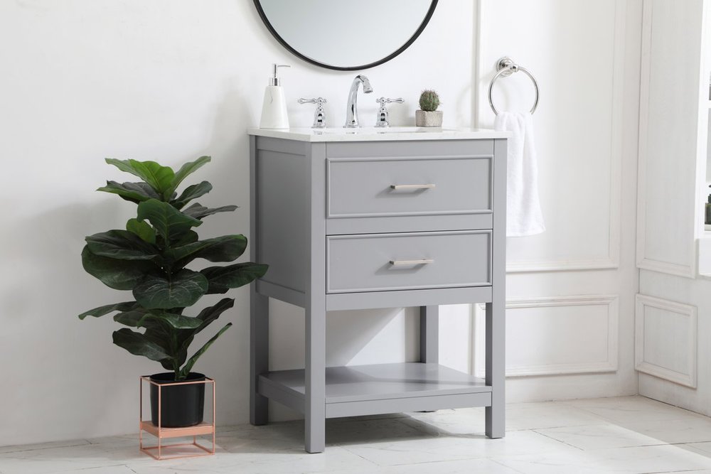 Make the most of your space with this 24" traditional style bathroom vanity. Its traditional style is able to complement many aesthetics with its grey finish, Calacatta engineered marble countertop, and the contemporary slender brushed nickel handle bar that sits on the upper false drawer and the lower u-shaped drawer, allowing you to store an assortment of bathroom essentials. The lower shelf makes it the perfect space to hold new towels for your guests. This compact vanity ensures both form and function in your bathroom or powder room for you and your guests.