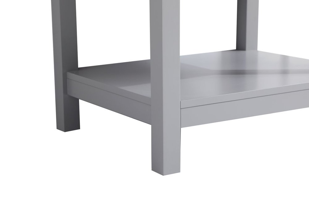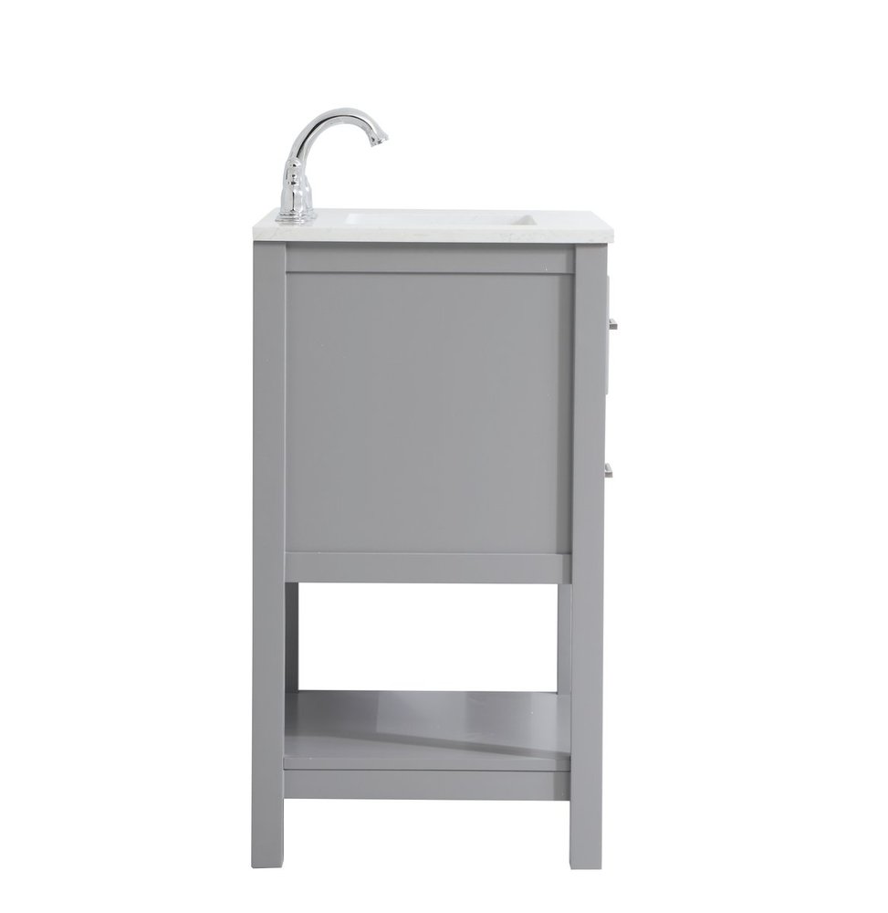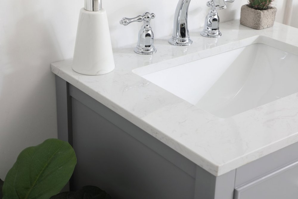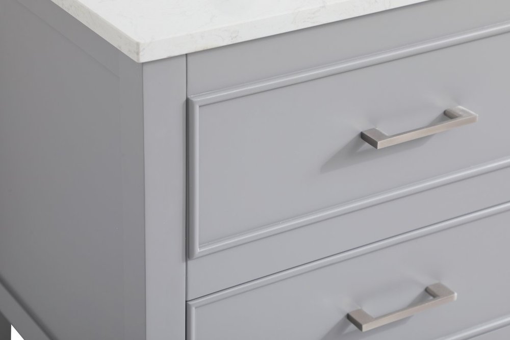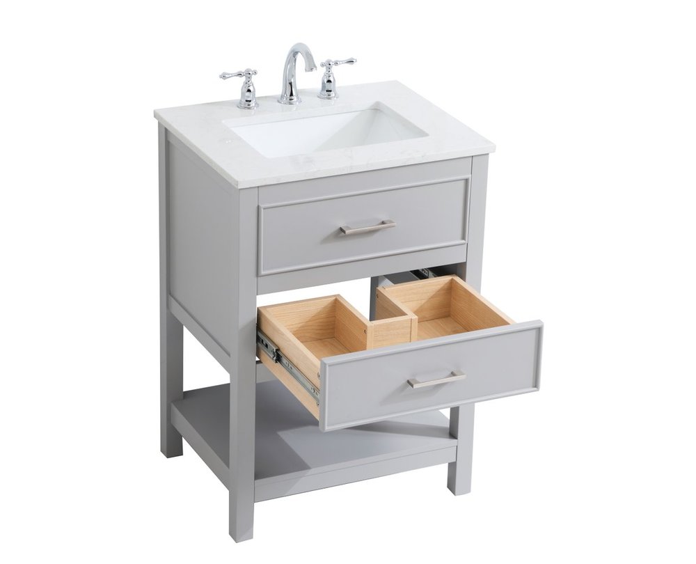 Make the most of your space with this 24" traditional style bathroom vanity. Its traditional style is able to complement many aesthetics with its grey finish, Calacatta engineered marble countertop, and the contemporary slender brushed nickel handle bar that sits on the upper false drawer and the lower u-shaped drawer, allowing you to store an assortment of bathroom essentials. The lower shelf makes it the perfect space to hold new towels for your guests. This compact vanity ensures both form and function in your bathroom or powder room for you and your guests.