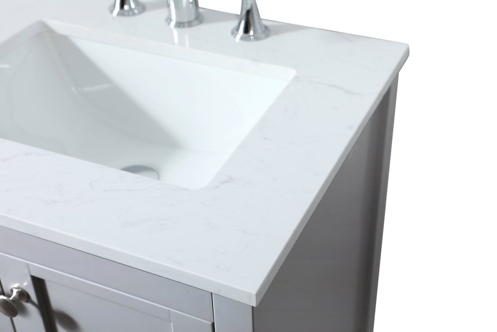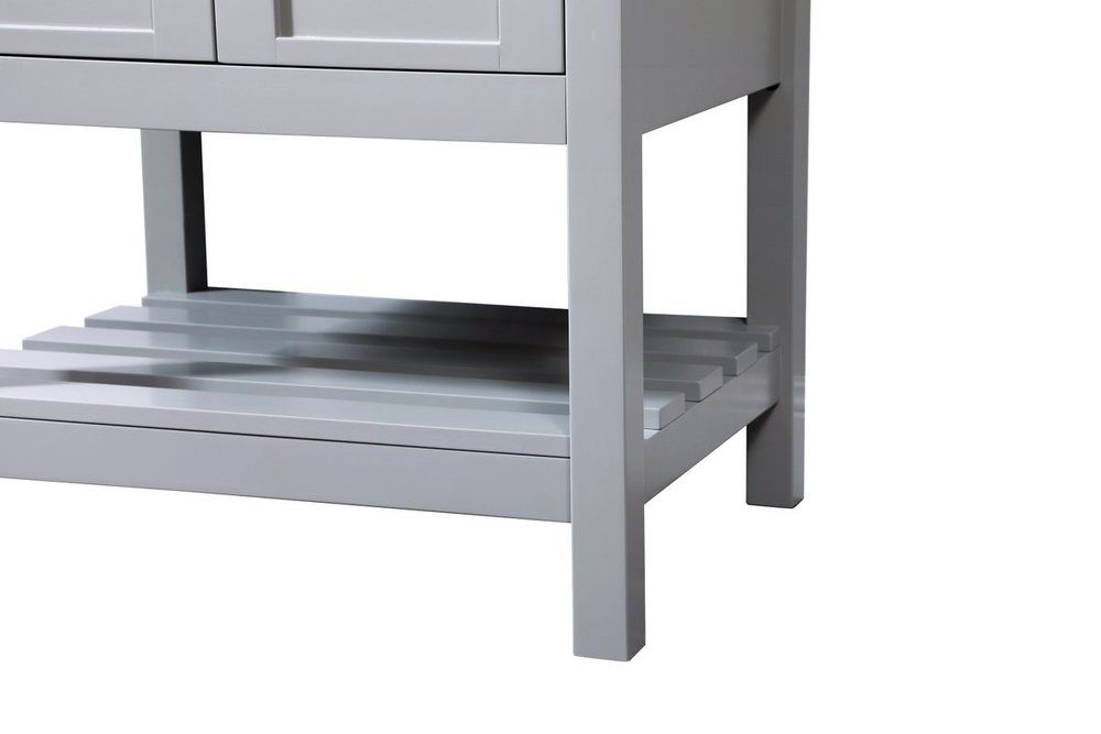 The subtle beauty of the Theo collection vanity exudes comfortable luxury. Its modern, yet traditional beauty will surely dress up your bathroom or powder room without any fuss. The calacatta engineered marble countertop and porcelain undermount sink shows quiet opulence, and the legs support upright without fail. Brushed nickel hardware complements the trendy gray finish, with pulls adorning the two cabinet doors, showcasing ample storage space within. Slated shelf allows for additional space to organize your towels. Whether this vanity is in your bathroom or for guests, its presence will surely elevate the aesthetics of your room.